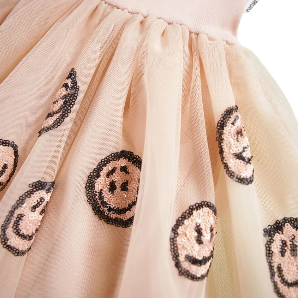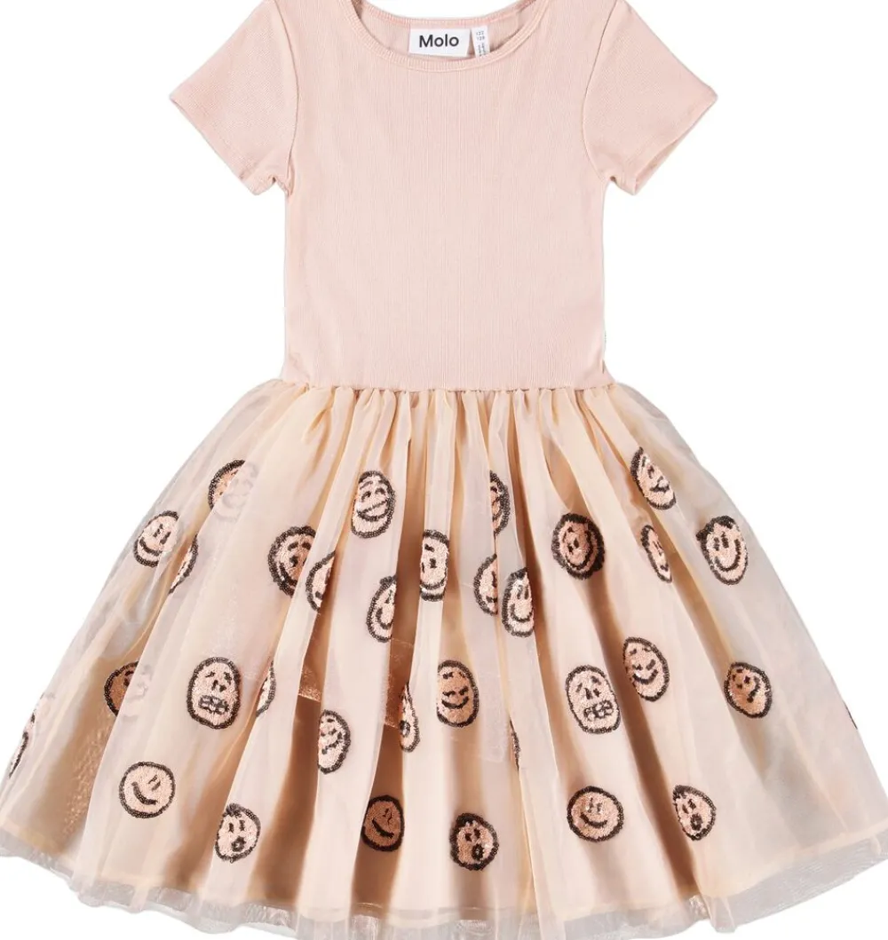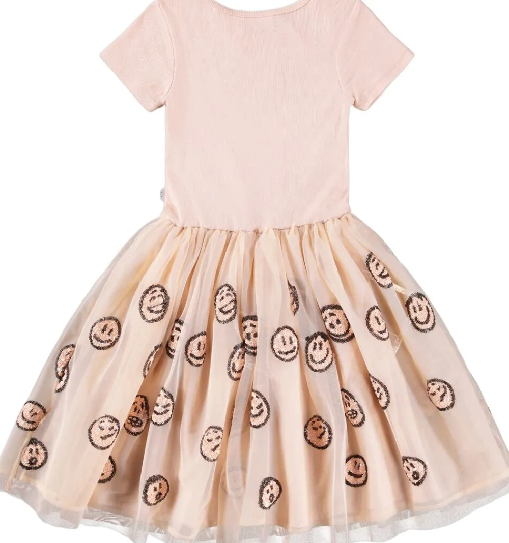 Denne lyserøde kortærmede kjole fra Molo har et matchende tylskørt med pailletansigter. Toppen er tætsiddende i ribbet bomuldsjersey med rund hals, mens skørtet når til knæet og har et bomuldsunderskørt for ekstra volumen.