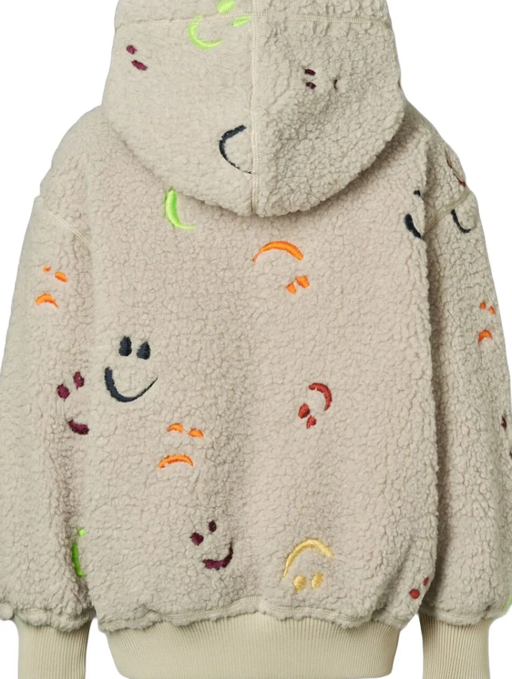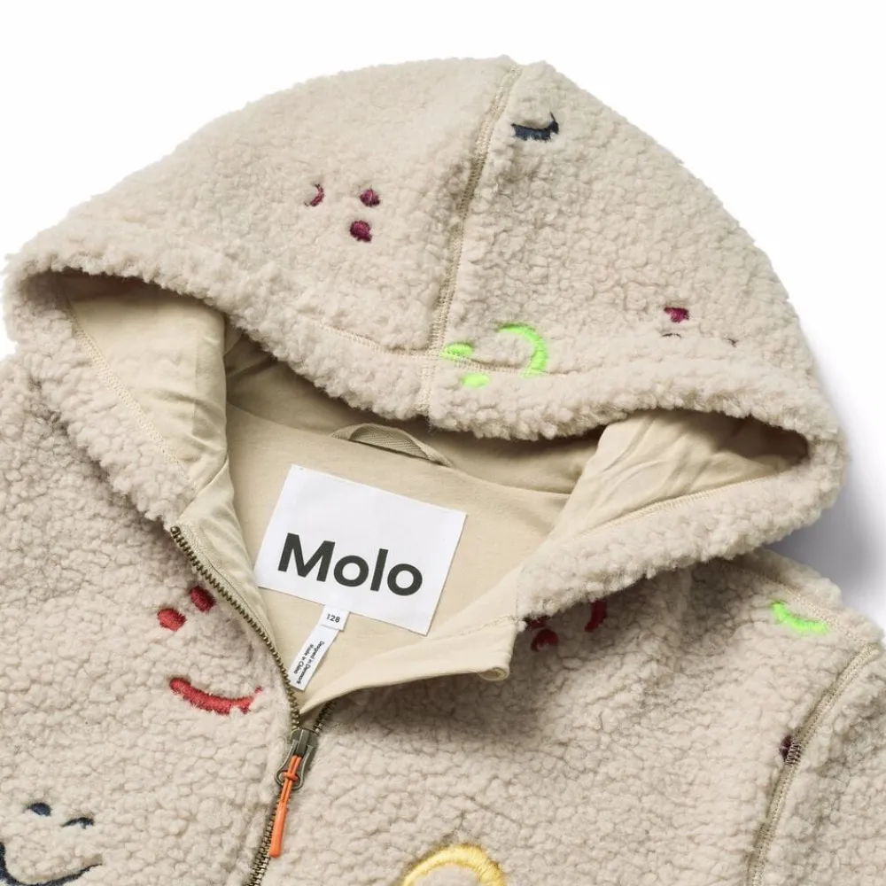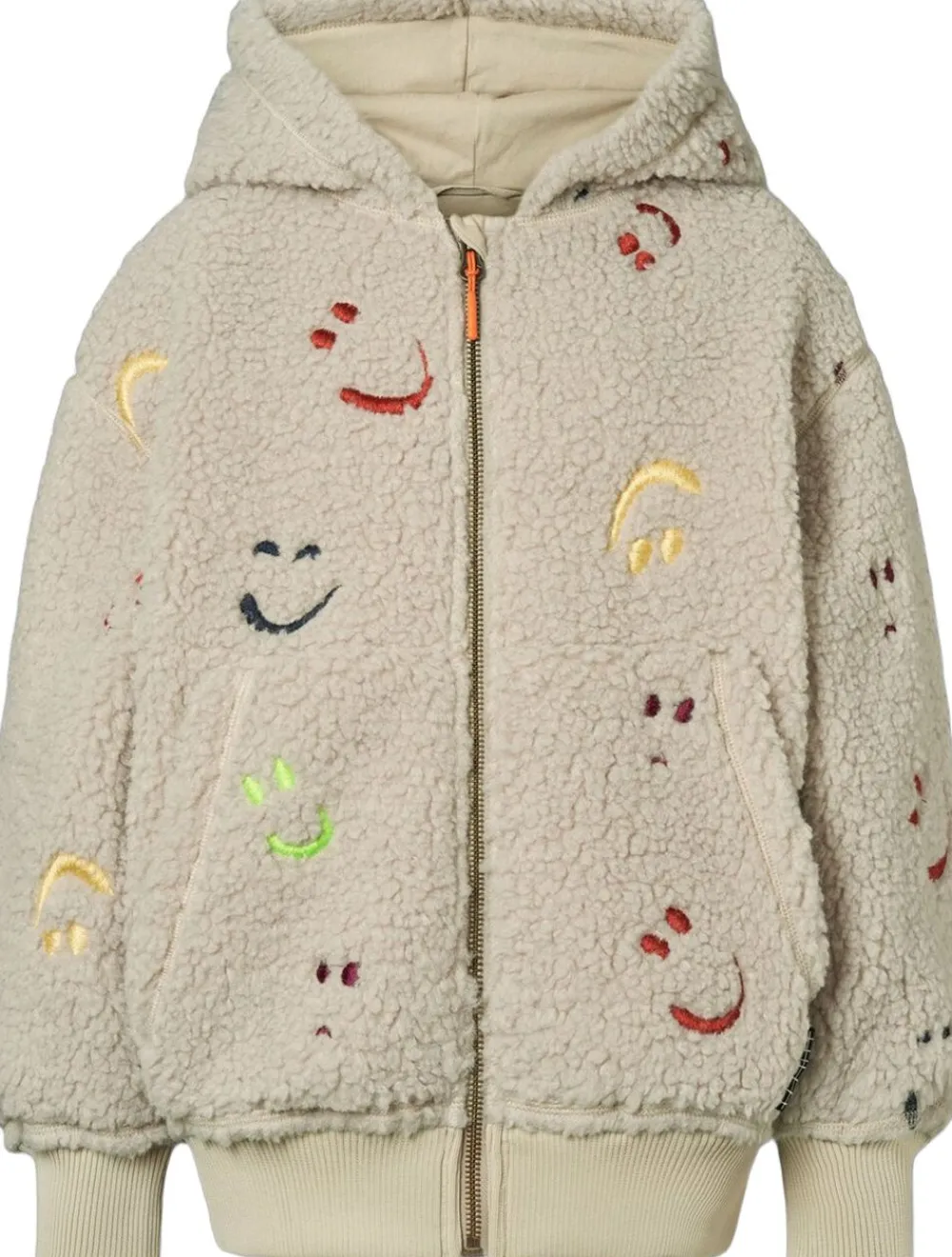 Denne beige fleecejakke fra Molo er lavet i genanvendt polyester med broderede farverige smilende ansigter. Jakken er oversize, har en praktisk lynlåslukning, matchende ribkanter og frontlommer. Den har et blødt og glat bomuldsfoer, der gør den behagelig at have på.