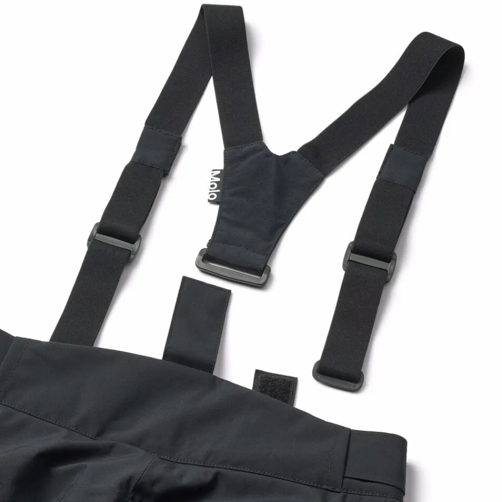 Disse sorte overtræksbukser fra Molo er lavet i genanvendt polyester. Bukserne har trykknap- og lynlåslukning, udvendige, justerbare velcro-stropper, bælte stropper til Molos seler (ekstra tilbehør), justerbar benåbning med snefang og ekstra forstærkning mellem benene. Der er vandtætte lommer, refleks bagpå, fleece foret udsatte steder og vatteret med 3M Thinsulate.