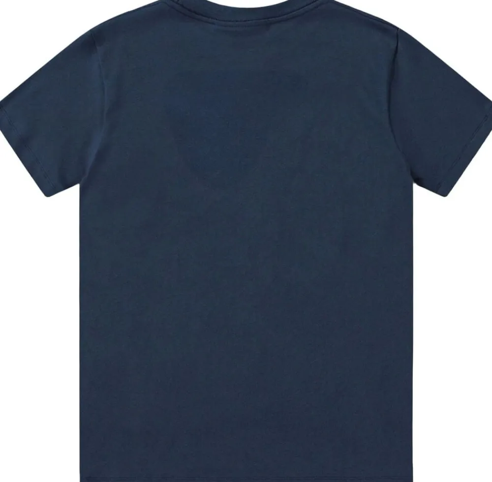 En økologisk bomuldst-shirt i beige farvetone, med korte ærmer, rund halsudskæring og en ribkant ved halsen. T-shirten tilbyder en afslappet pasform og et livligt placement print på fronten. Printet forener elementer fra fortiden og fremtiden, hvor en robot-dinosaur og dens venner samles ved tankstationen for en sjov aften sammen.