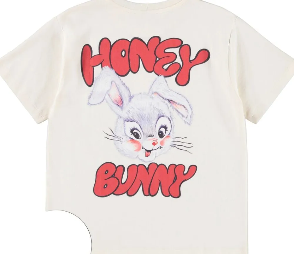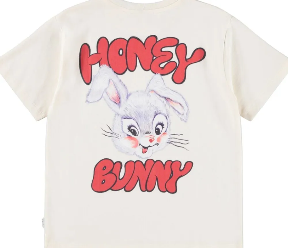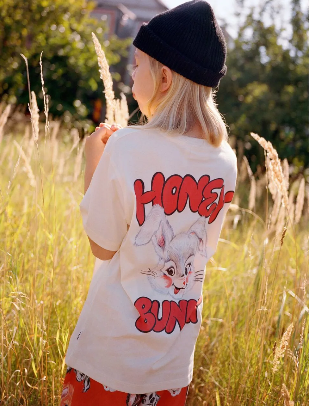 En økologisk bomuldst-shirt i beige farvetone, med korte ærmer, rund halsudskæring og en ribkant ved halsen. T-shirten tilbyder en afslappet pasform og et livligt placement print på fronten. Printet forener elementer fra fortiden og fremtiden, hvor en robot-dinosaur og dens venner samles ved tankstationen for en sjov aften sammen.