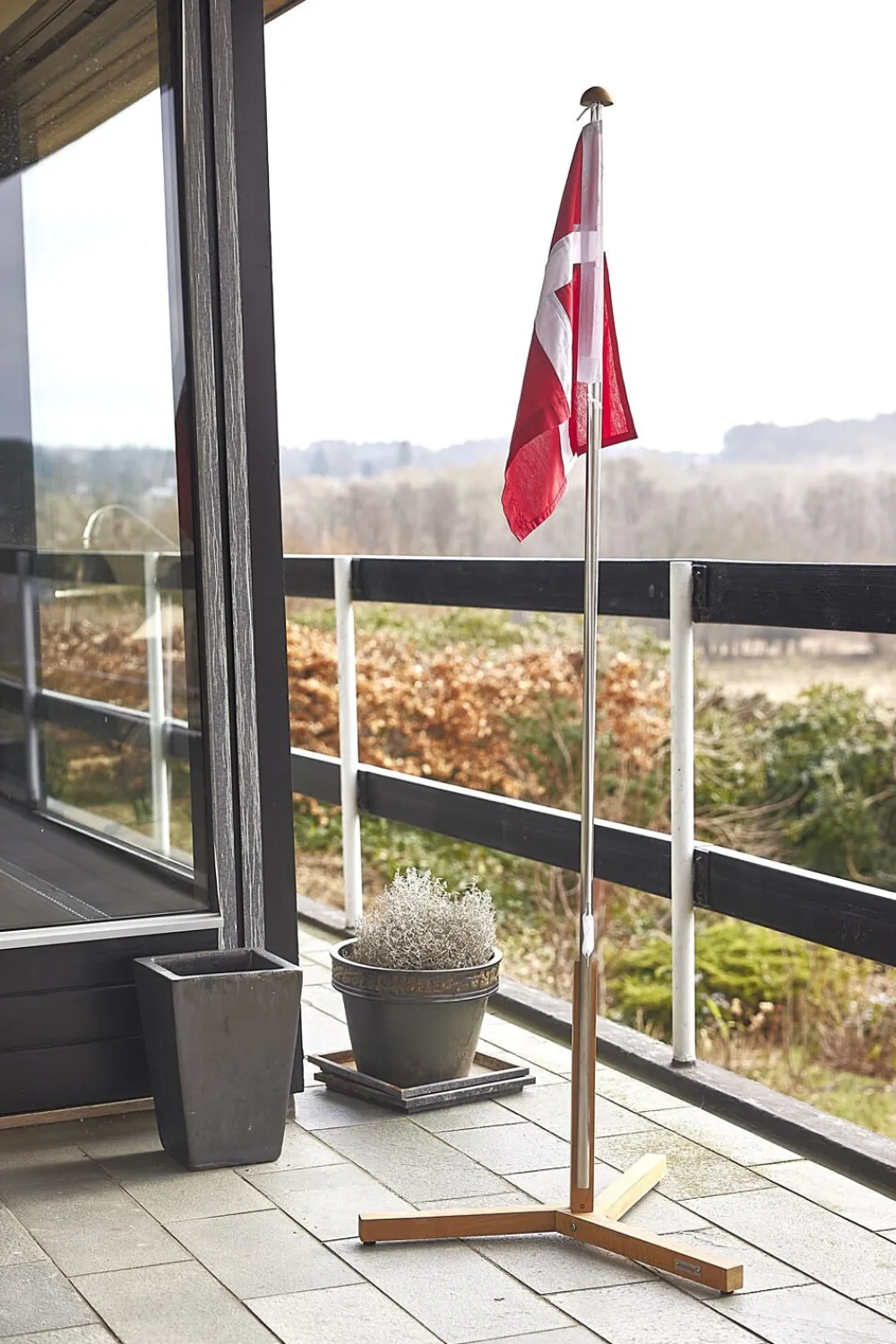 Flagstang i teak & rustfrit stål med Dannebrogsflag. Flagstangen er i rustfrit stål og med fod og knop i bæredygtig indonesisk teak. Byd gæsterne velkommen ved indgangen til festen, i din opgang eller placer den ved gavebordet, når der skal fejres mærkedage.Leveres med et smukt forarbejdet Dannebrog af bomuld. Det er desuden let at udskifte Dannebrogsflaget med andre flag.