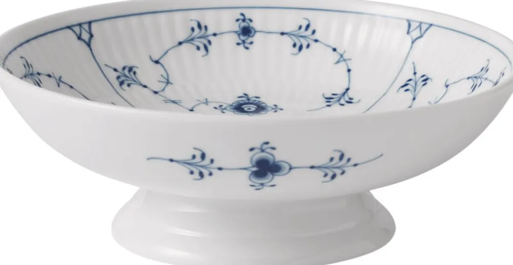 Musselmalet Riflet bærer Royal Copenhagens historie og traditioner med sig ind i nutiden. Mønstret er indbegrebet af tidløshed og alsidighed og det samme gælder de mange klassiske stelforme, der i dag er gemt i Royal Copenhagens arkiver. En af disse gemte skønheder er den lille ska?l pa? fod. Perfekt til servering af sma? kager eller andre søde sager.