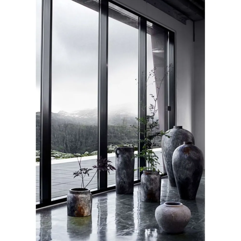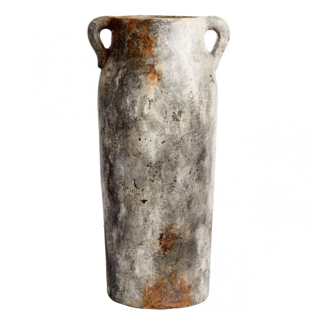 Krukke Echo 70 er en håndlavet høj slank krukke med “ører” på hver side. Den smukke form gør den anvendelig og smuk med store tørrede grene eller blomster, men pga. dens smukke form kan den også stå alene som et kunststykke i ethvert hjem. Krukken er malet af flere omgange, hvilket giver den en varm grålig farve med rust finish. Krukken er til indendørs brug.