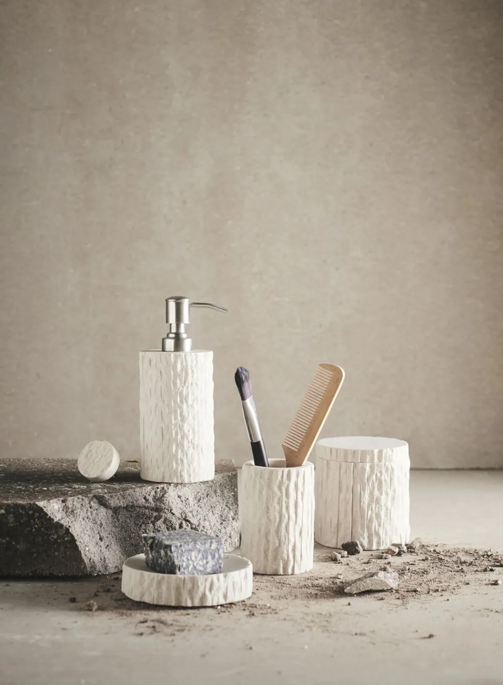 Kama er skabt med en riflet og rustik struktur i overfladen, der skubber til grænsen for badeværelsestilbehør. Seriens organiske former og charmerende detaljer tilføjer personlighed og sjæl til badeværelset, og sammen med en naturlig og rolig nuance, opnår serien et solidt og skulpturelt udtryk.