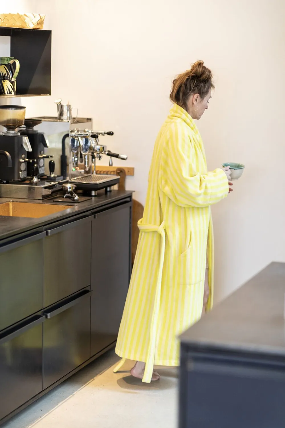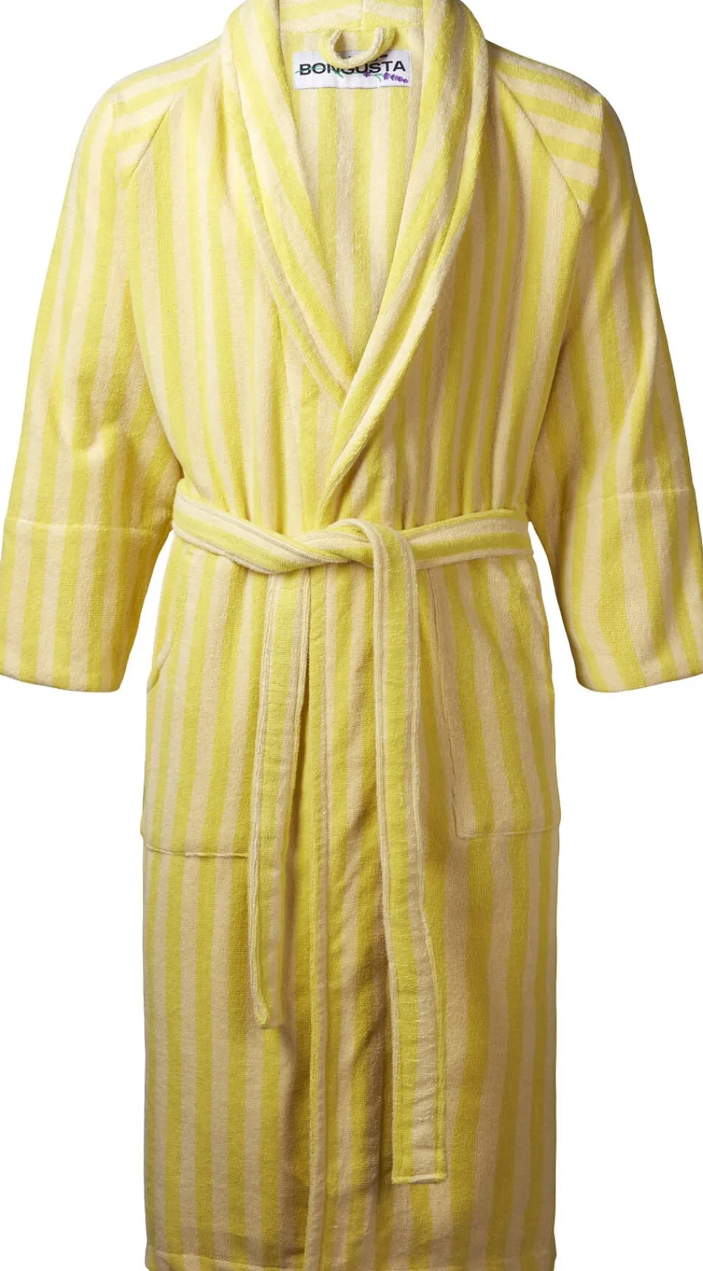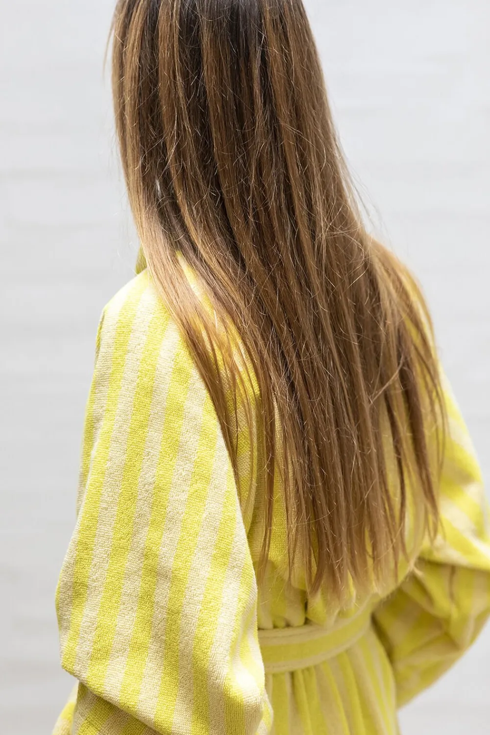 Giv dig selv et blødt kram med den luksuriøse Naram badekåbe. Badekåben har en generøs pasform og giver god dækning – perfekt til når du kommer op af havet, poolen eller ud af badet. Naram badekåben har et klassisk, men moderne design med fine farver og striber. Badekåben kommer med sjalkrave, åben front, bæltelukning og to rummelige lommer – perfekt til afslappede morgener eller bare til hygge i sofaen. Naram badekåben er OEKO-TEX® certificeret og lavet af 100 % kæmmet bomuld vævet i en 385 gsm-kvalitet som giver en høj absorberingsevne. Den specielle kæmmeteknik polerer bomuldsfibrene, så de opnår glans og en silkeblød fornemmelse ved hver brug. Fås i to størrelser: S/M og L/XL. Mål fra nakken bagpå til bundsøm: S/M = 122 cm og L/XL = 138 cm. Hvis du er højere end 176 cm eller foretrækker et oversize look, anbefaler vi, at du vælger en størrelse L/XL.