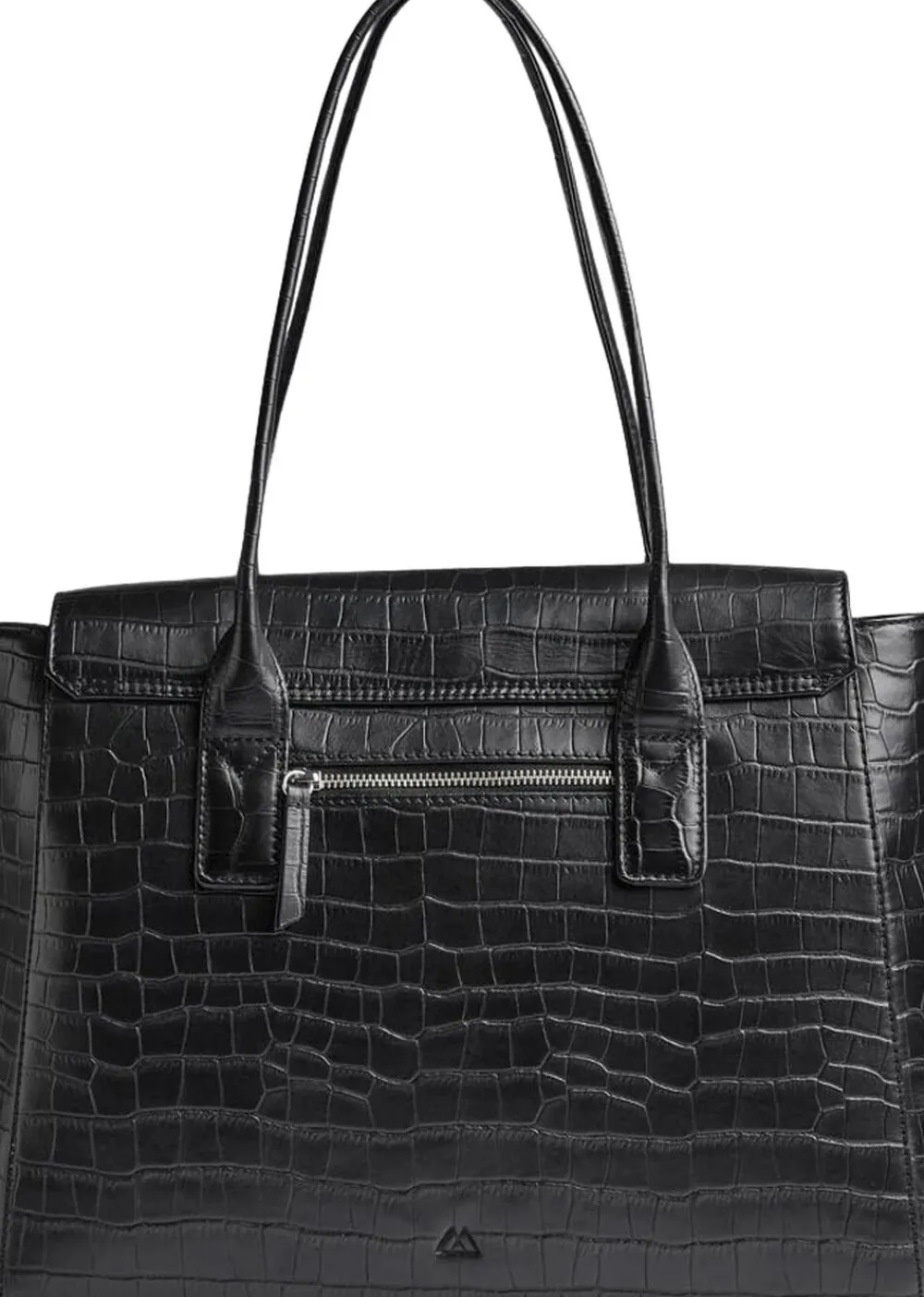 Natalie Work Bag fra Markberg er en stilfuld og funktionel arbejdstaske, ideel til moderne kvinder, der ønsker både praktisk opbevaring og elegant design. Tasken er fremstillet af kalveskind, med et cool croco udtryk. Tasken har to indvendige lynlåslommer, to ekstra rum samt to små lommer, der gør det nemt at organisere dine ejendele. Den har plads til en 14 computer, hvilket gør den perfekt til arbejde eller studier.