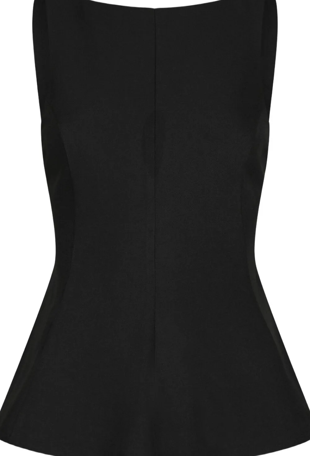 Ærmeløs top med åben ryg. Toppen har en rund halsudskæring, vidde i bunden og bindes på ryggen. Den har en almindelig pasform. Modellen er iført størrelse 36.