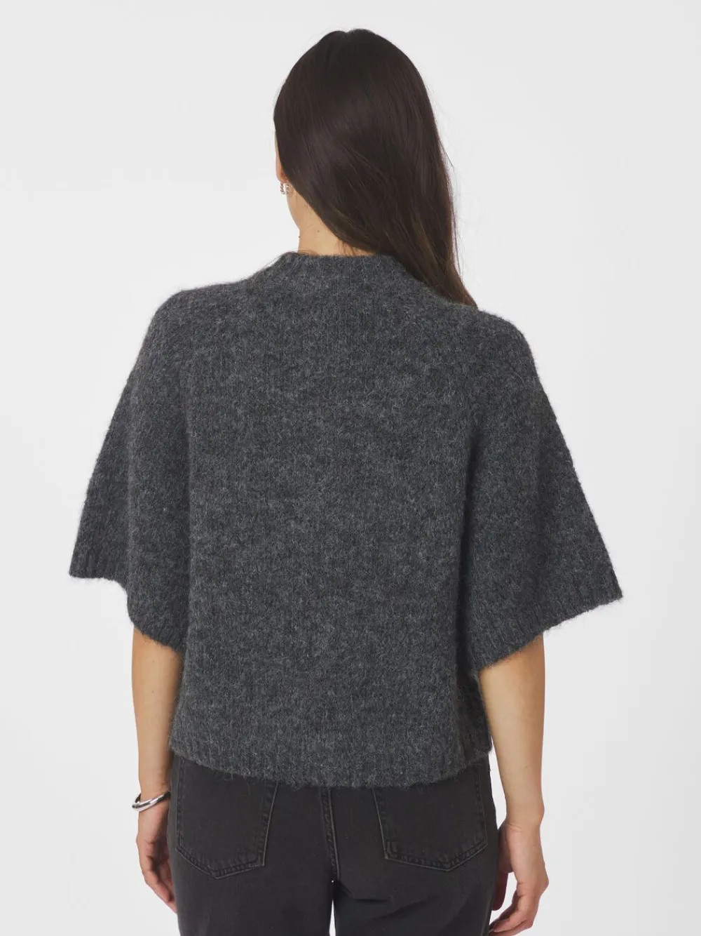 Cardigan med korte ærmer. Cardiganen har en rund halsudskæring, ærmer med vidde og en åben front med tre dekorative knapper. Den er lavet i en blød, fluffy kvalitet og har en løs pasform. Modellen er iført størrelse 36.