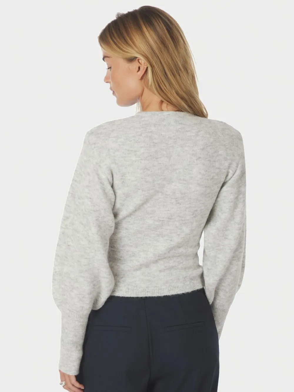 Strikket cardigan med lange ærmer. Cardiganen har en rund halsudskæring, ballonærmer med tætsiddende manchetter og lukkes med knapper langs fronten. Den har en lille slids foran. Materialet er en blød uldblanding, og den har en tætsiddende pasform. Modellen er iført størrelse 36.