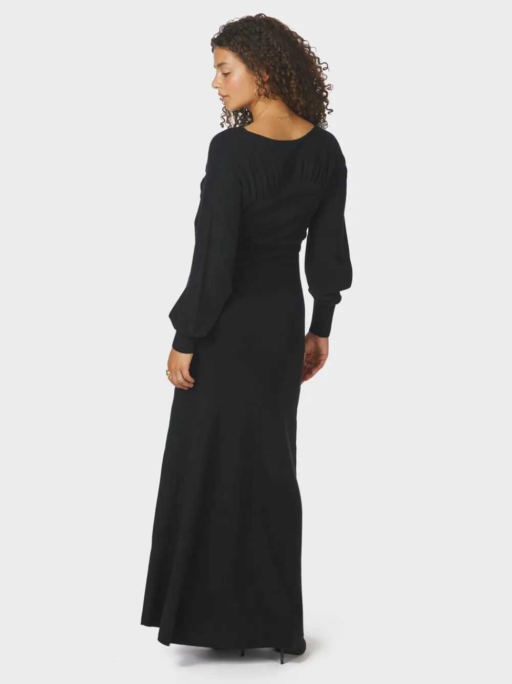 Strikket maxikjole med lange ærmer. Kjolen har bådudskæring, rynkedetaljer og tætsiddende manchetter. Den er lavet i en blød, strækbar viskoseblanding og er ribstrikket. Pasformen er almindelig. Modellen er iført størrelse 36.