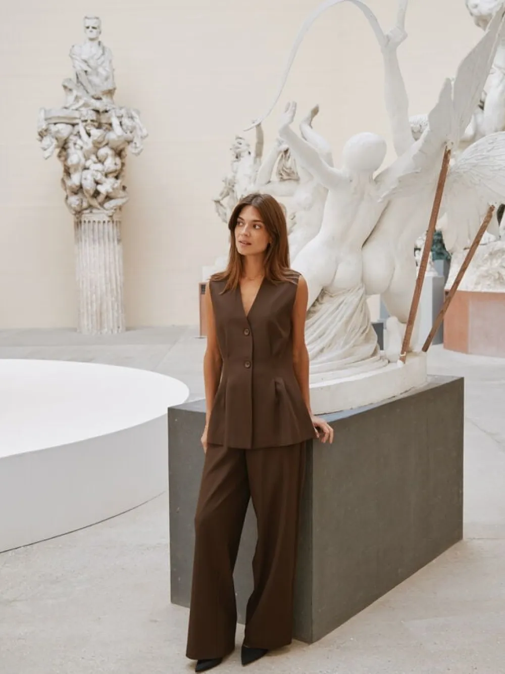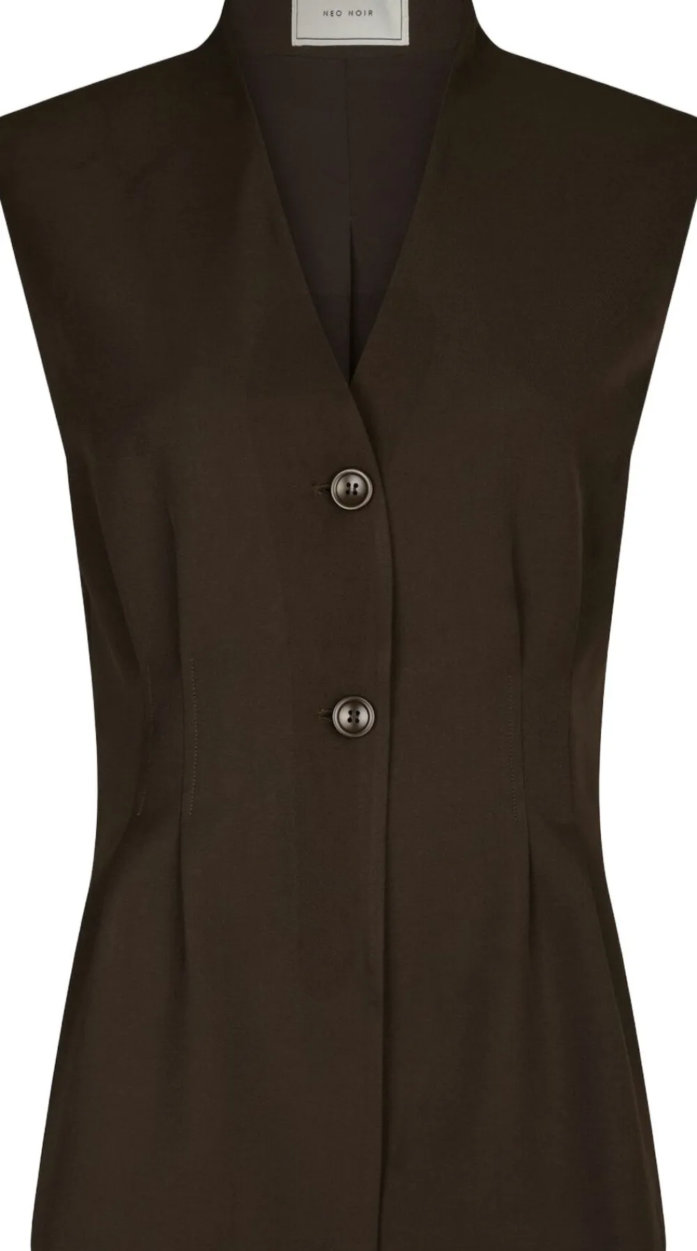 Lang vest i et figursyet design. Vesten har en v-udskæring, lukkes med knapper foran og kan bruges både alene eller med en top under. Den er fremstillet i en struktureret kvalitet og har en tætsiddende pasform. Modellen er iført størrelse 36.