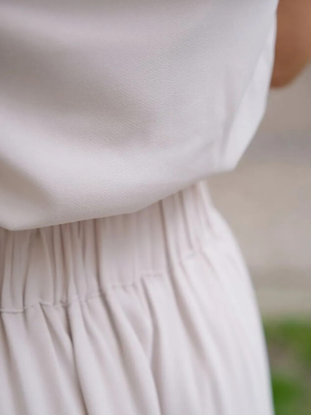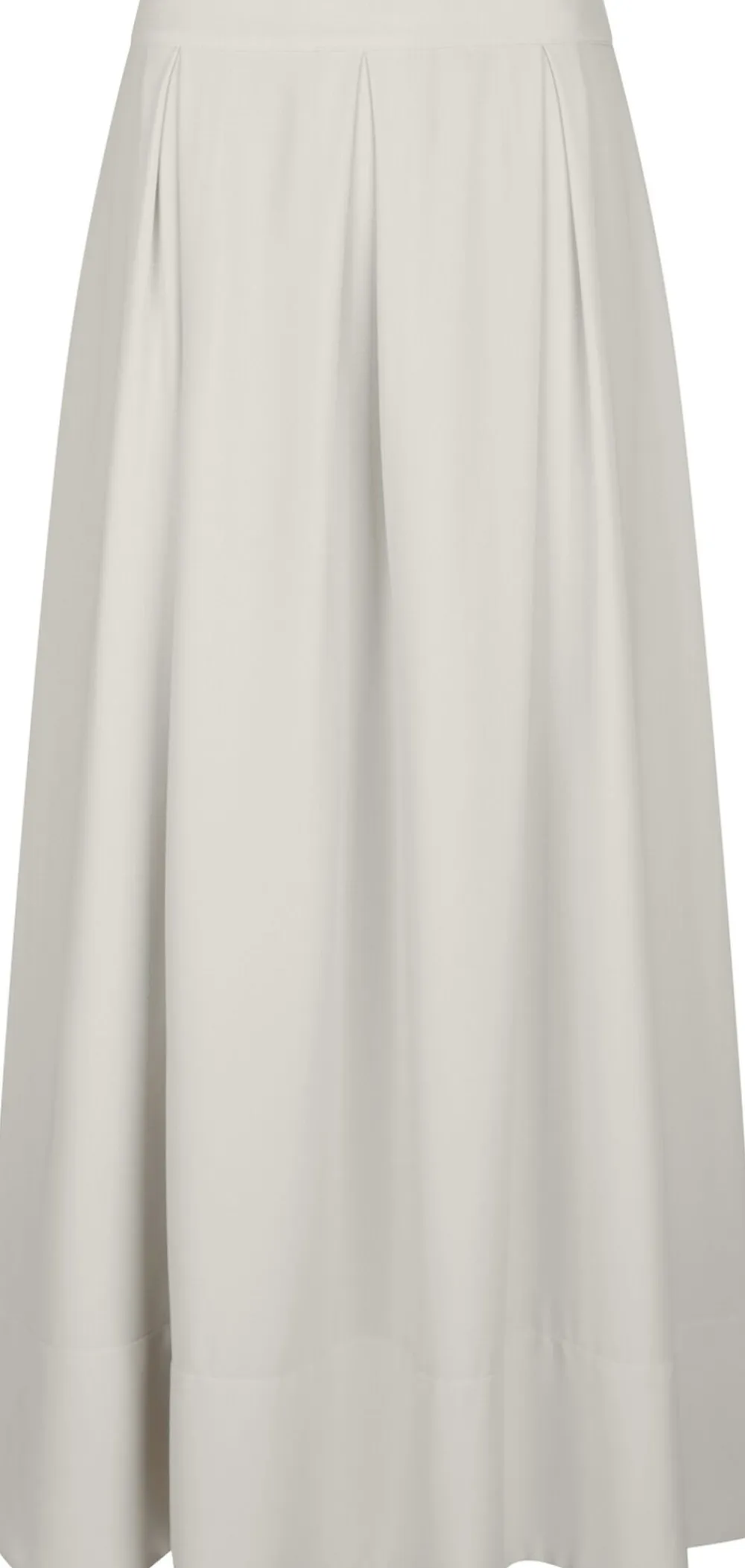 Midi nederdel med læg, der falder flot. Nederdelen har et bredt taljebånd med elastik bagpå, der gør den behagelig at have på. Pasformen er almindelig. Modellen er iført størrelse 36.
