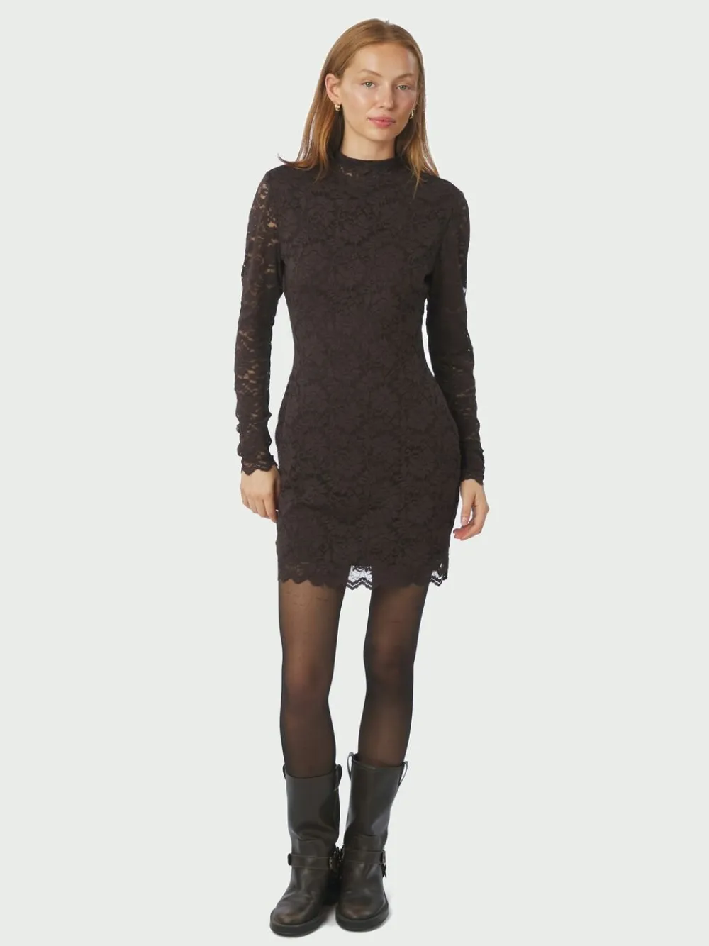 Kort kjole i blonde. Kjolen har en høj hals, tungekanter og lukkes med en nøglehulslukning i nakken. Den har en påsyet underkjole på kroppen, som gør, at den ikke er transparent. Pasformen er tætsiddende, og materialet indeholder stræk. Modellen er iført størrelse 36.