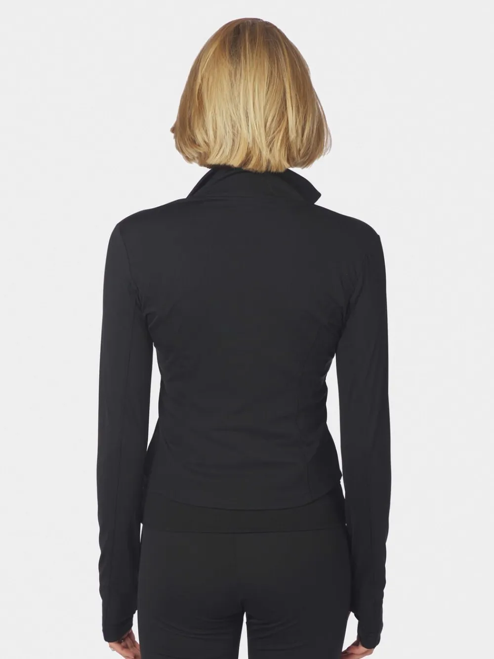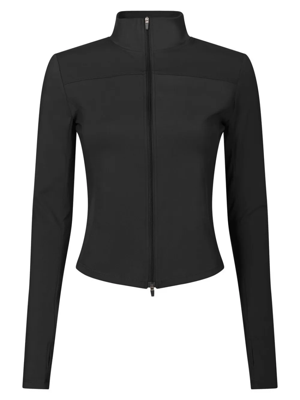 Langærmet bluse med lynlåslukning foran. Blusen har høj hals, ærmer med hul til tommelfingeren og en tætsiddende pasform. Den er lavet i et strækbart materiale. Modellen er iført størrelse 36.