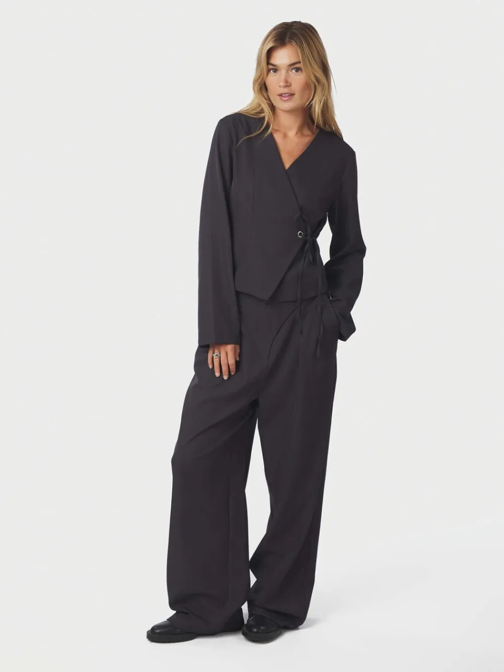 Langærmet bluse med slå-om-detalje. Blusen har en V-udskæring, en metalring foran samt en asymmetrisk front, der lukkes med et justerbart bindebånd. Bindebåndet kan tilpasses efter, hvor tæt en pasform der ønskes. Modellen er iført størrelse 36.
