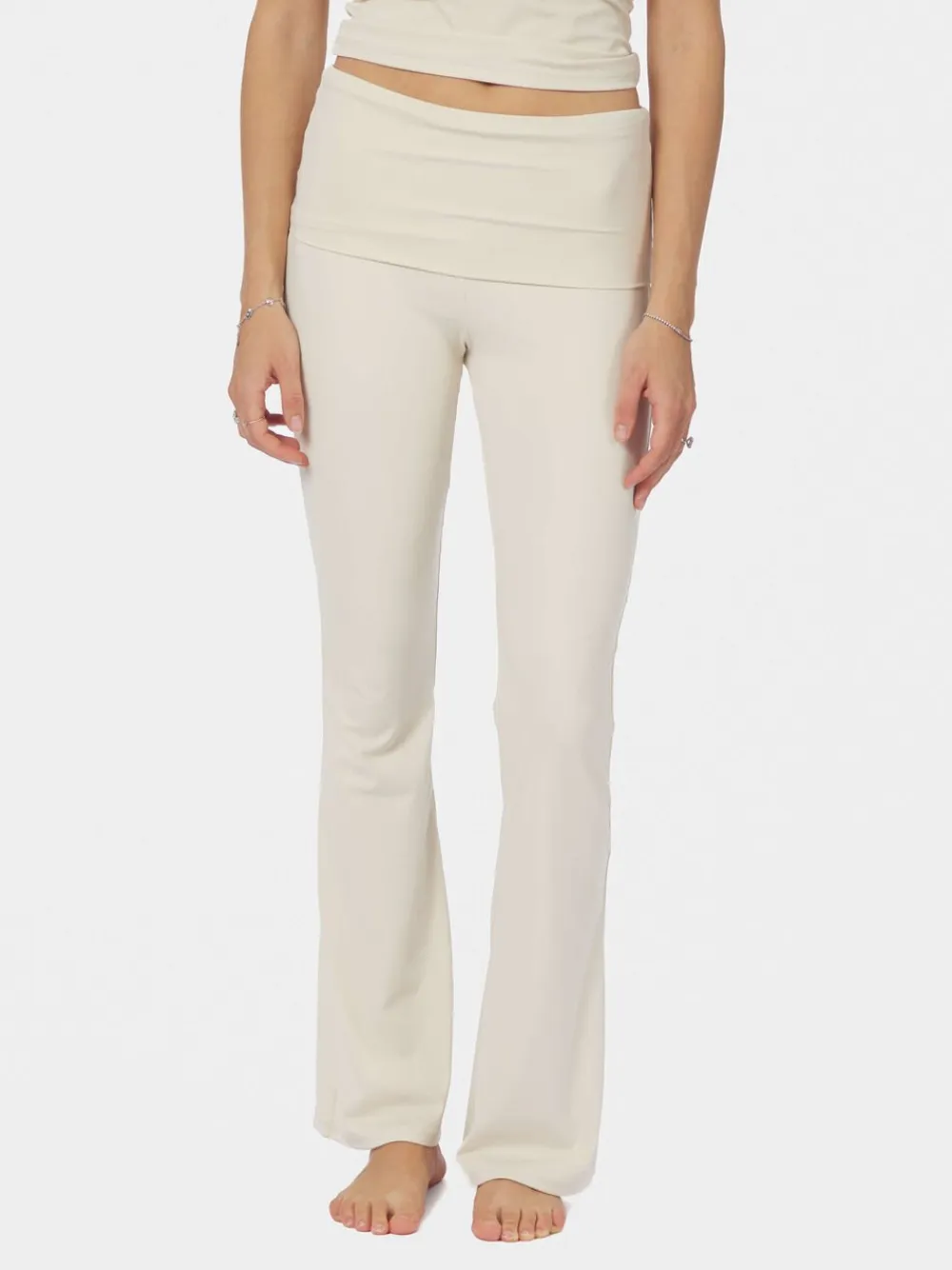 Højtaljede bukser med flared ben. Bukserne har en høj linning, der kan foldes ned. De er lavet i et materiale med meget stræk. Modellen er iført størrelse 36.