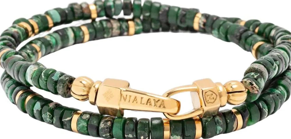 Herre mørkegrønne malachit Heishi Wrap armbånd, 4 mm mørkegrønne malachitperler, låse og perler i 18k guldbelagt 316L rustfrit stål. Håndlavet i Los Angeles