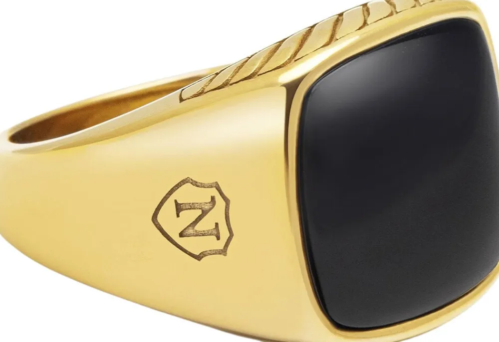 Skiltring til herrer med allergivenligt rustfrit stål med 18K guldplade, grøn Jade-sten og graverede detaljer. Håndlavet i Los Angeles
