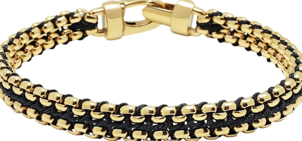 Black Woven Box-kædearmbånd til Herre i rustfrit stål med guldplade og lås i rustfrit stål med guldplade. Armbåndsbredde: 8 mm. Håndlavet i Los Angeles