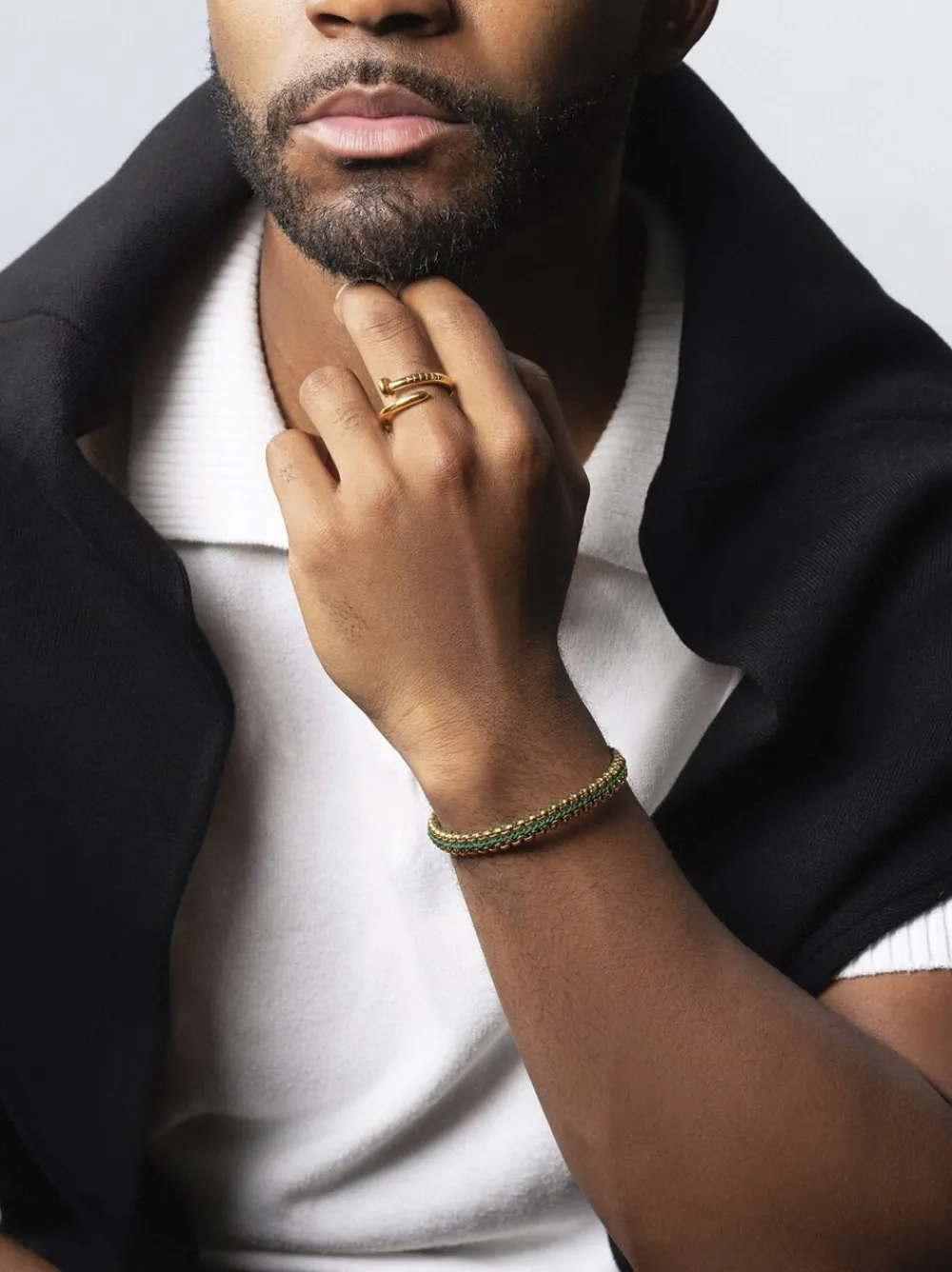 Grøn vævet Box Chain Bracelet til Herre i rustfrit stål med guldplade og lås i rustfrit stål med guldplade. Armbåndsbredde: 8 mm. Håndlavet i Los Angeles