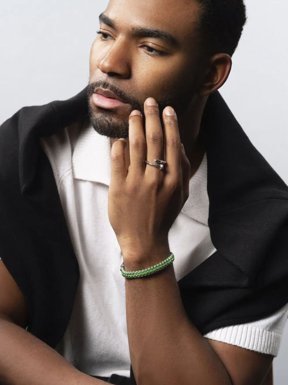 Grøn vævet Box Chain Bracelet i rustfrit stål til Herre med lås i rustfrit stål. Armbåndsbredde: 8 mm. Håndlavet i Los Angeles