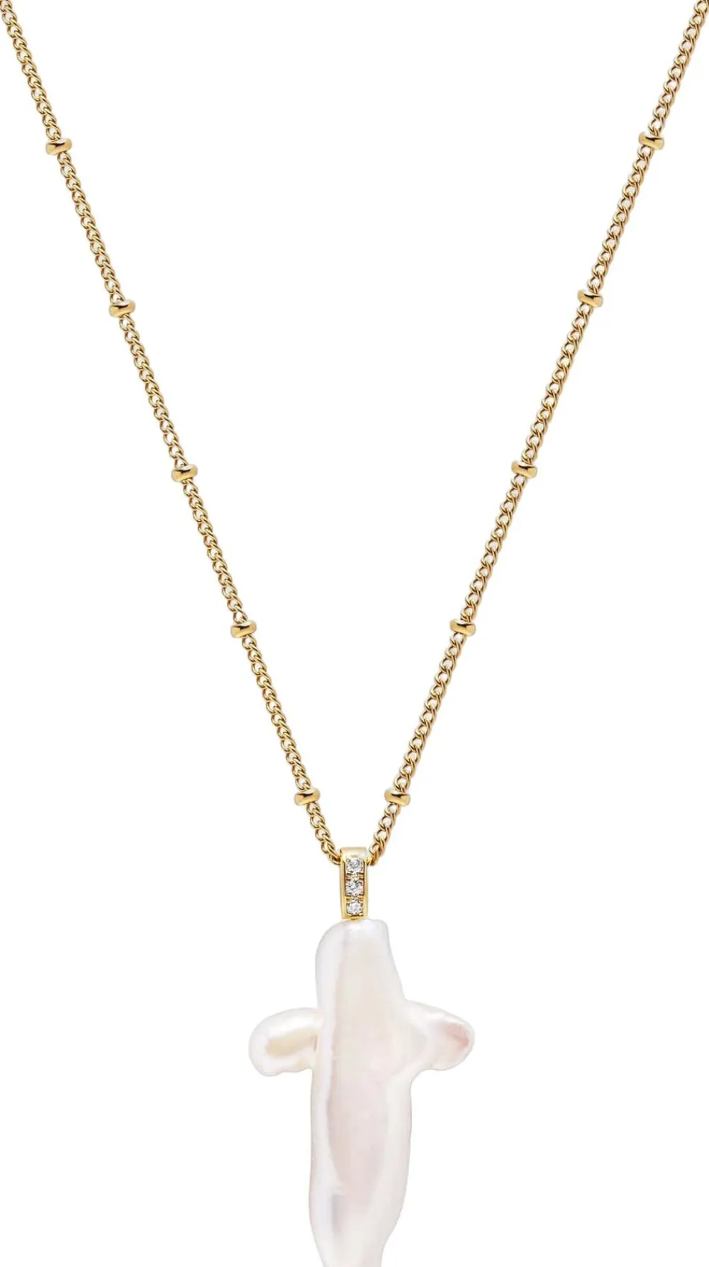 Pearl Cross Chain Necklace til kvinder med en unik, naturlig perle, der er formet som et kors som midtpunkt. Vi bruger dyrkede perler fra østers og ferskvandsmuslinger, som vi håndvælger til alle vores smykker. Låsen er lavet af rustfrit stål med 18k guldbelægning. Håndlavet i Los Angeles