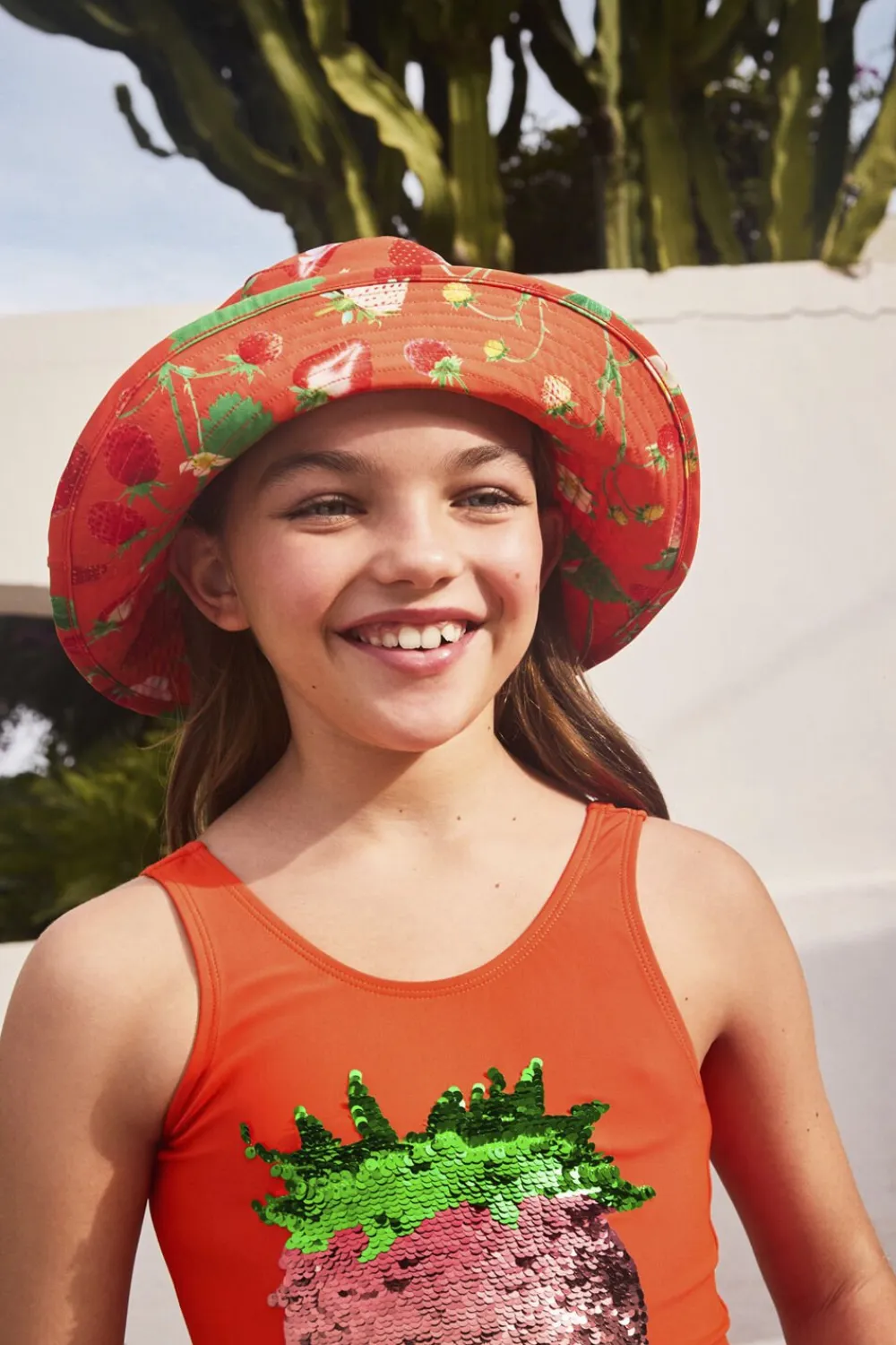 Lyserød badedragt med smilende smiley-print på forsiden. Lavet af genanvendt, elastisk polyester for komfort og nem påklædning. Med en høj UV-beskyttelse på 50+ er den ideel til solbeskyttelse.
