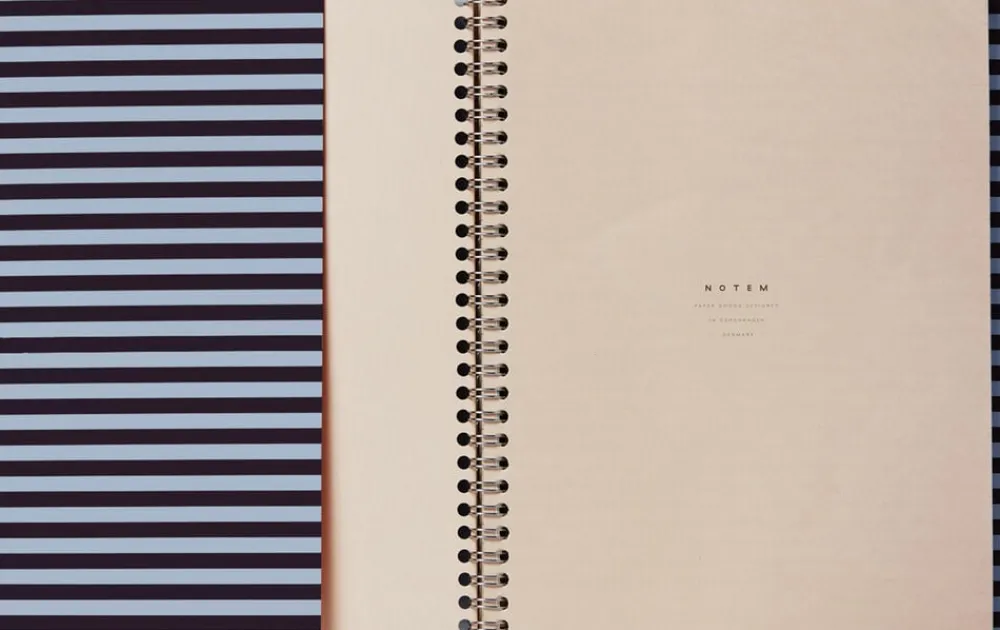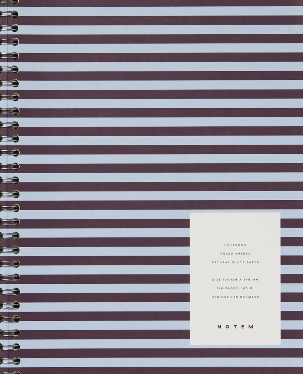 Softcover notesbog fra Notem Studio. Bogen er bundet med spiralryg. Indhold: 160 sider, Linjer på all. Farve: Bordeaux og blå. Mål: 185 x 240 mm. Designet i Danmark.