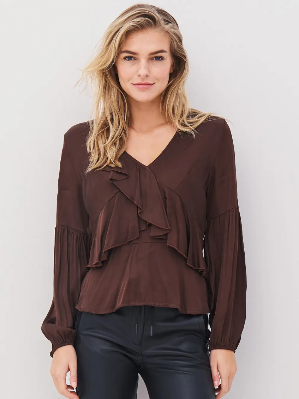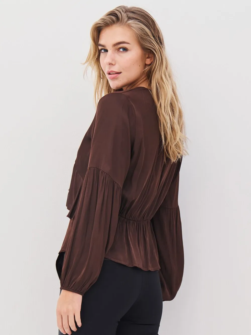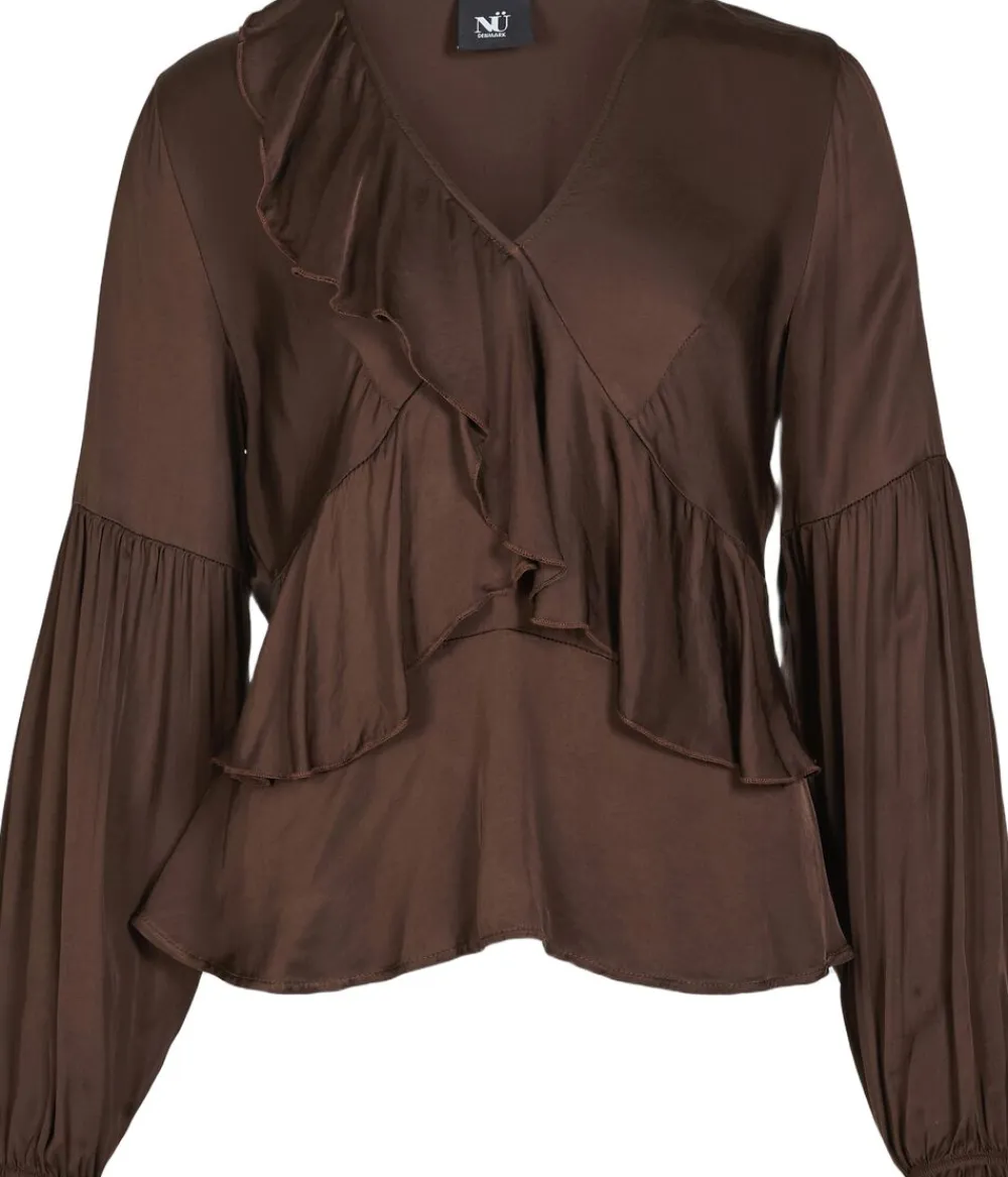 Blusen har en let og blank finish med elegante flæsedetaljer foran, hvilket skaber en feminin og livlig silhuet. Den har lange, voluminøse ærmer med rynker og en diskret elastik i taljen, der giver en let peplumeffekt og understreger figuren. Den bløde V-halslinje fremhæver det romantiske udtryk, hvilket gør blusen velegnet til både hverdagsbrug og aftenbrug. Style den med et par smalle jeans og støvler for et afbalanceret og moderne hverdagslook. (( Modellen er 180 cm høj og bærer en størrelse S. )) (((- Flæser foran. – Elastik i taljen. – Voluminøse ærmer. )))