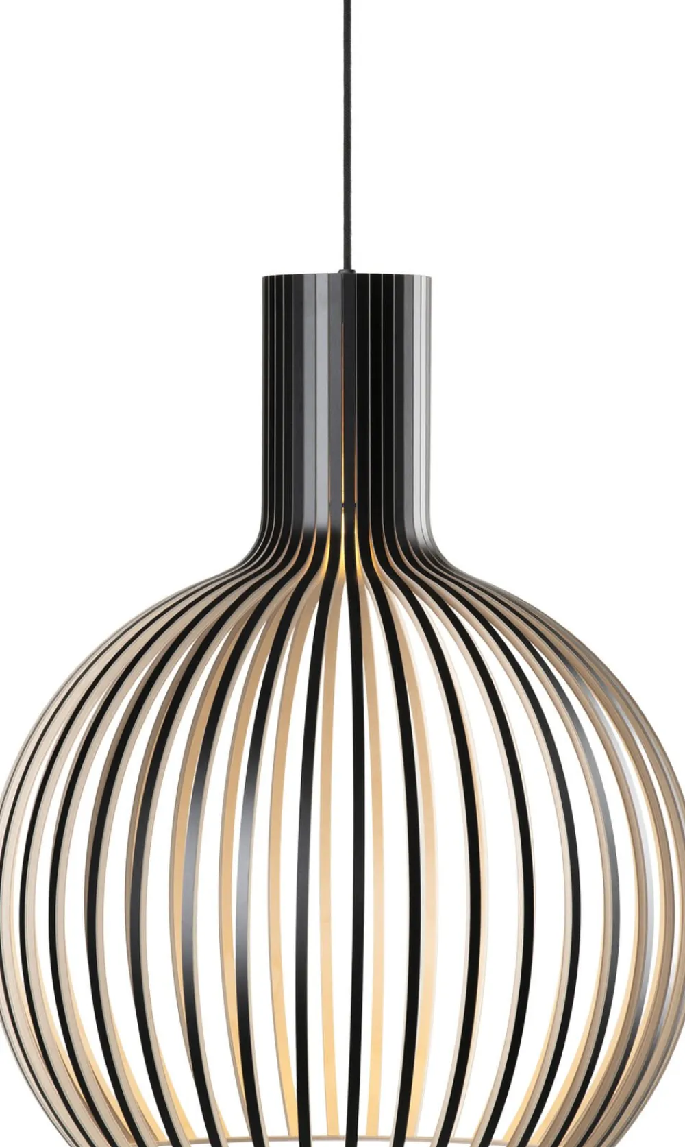 Secto 4241 – den smukke loftslampe fra finske Secto. Lampen er designet af Seppo Koho for Secto design og er kendetegnet ved sin enkelhed og runde form. Lampen er fremstillet i Finland og er lavet af formstøbte birkerør. Secto Octo 4241 fås i fire forskellige farver: Sort, hvid, birk og valnød. Lampen giver et utroligt behageligt og elegant lys, der spredes gennem lampens lameller. Ud over det behagelige lys giver lampen også et nyttigt nedadrettet lys, hvilket gør pendlen perfekt til at hænge over spisebordet. Octo-lampen er en stor lampe, men selve designet får lampen til at virke meget luftig og gør det derfor muligt at bruge lampen i mindre rum. Selvom Secto er et relativt ungt mærke, kan Octo 4241-lampen allerede betragtes som en klassiker.