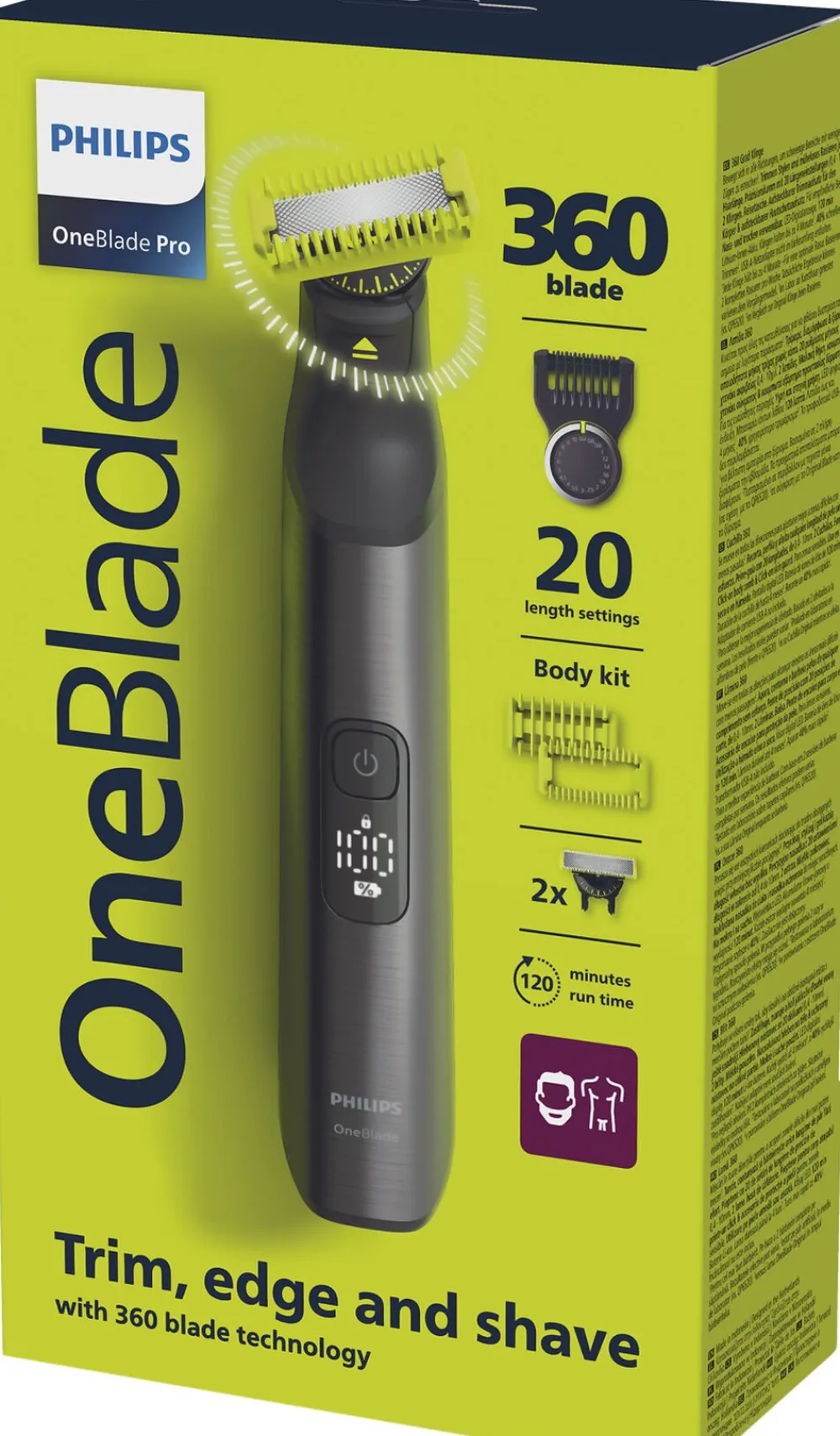 Philips OneBlade Pro Face + Body trimmer, barberer og styler hår i alle længder. Du får et blad til ansigtet og et blad til kroppen, inklusive et hudbeskyttelsestilbehør. Med Philips OneBlade behøver du kun ét værktøj til din stil.