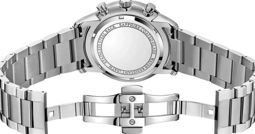 Dette kronograf-stil ur er udstyret med kvarts urværk og tilbyder essentielle funktioner som datovisning og stopur. Lænken i rustfrit stål i sølv er sikret med en foldelås, hvilket sikrer komfort og nem brug. Med en vandtæthed på 10 ATM er dette ur velegnet til svømning. Lumen på viserne sikrer synlighed i mørket, hvilket øger dets praktiske anvendelighed. Uret er beskyttet af safirbelagt mineralglas, hvilket forbedrer dets holdbarhed.