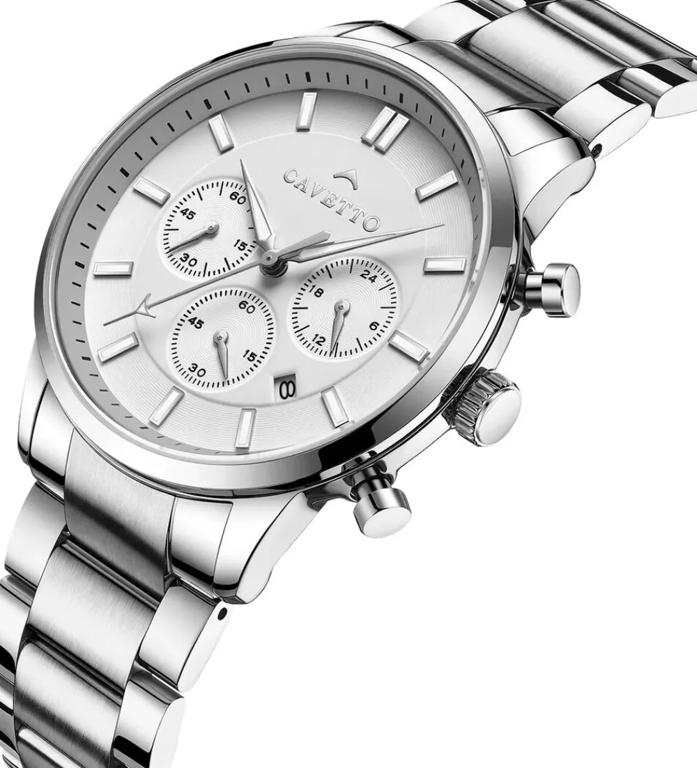 Cavetto Pantheon CV0003 er et imponerende ur, der kombinerer en moderne kronografstil med praktiske funktioner. Uret har en rund urkasse med en glat finish og et rent urskivedesign, der inkluderer tre kronografer. Timeindikatorerne er lette at læse, og det har to trykknapper og en krone på siden, hvilket fremhæver dets klassiske kronograflook. Stål-lænken er sammensat af sammenkoblede segmenter, hvilket sikrer en behagelig pasform. Det overordnede design er rent og moderne, hvilket gør det velegnet til forskellige lejligheder.