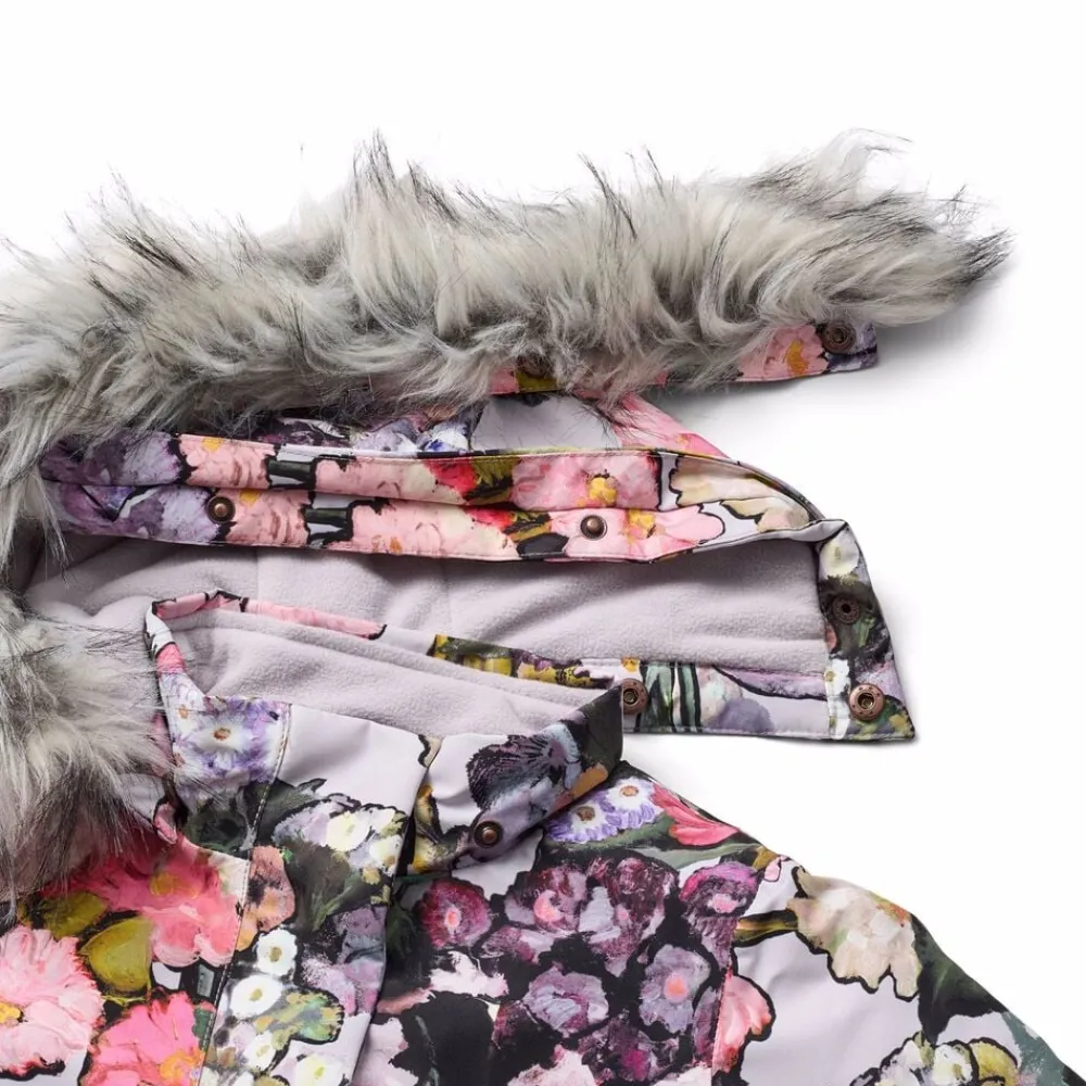 Denne sorte jakke fra Molo er lavet i genanvendt nylon med praktisk lynlåslukning, høj krave og aftagelig hætte med faux fur kant. Jakken er knælang og har frontlommer, ribkant ved håndleddene og en stor refleks bagpå.
