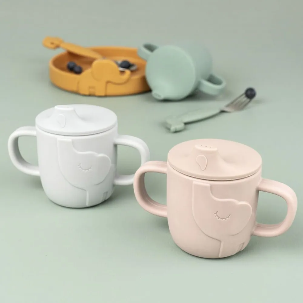 Peekaboo tudekoppen er en perfekt 2-i-1 kop til at øve at drikke selv. Tudekop-låget forhindrer, at væske løber ved siden af. Når dit barn er klar, kan låget tages af. De to håndtag på koppen vil sikre et godt greb for de små hænder. Den søde Elphee tudkop er lavet af fødevaregodkendt silikone, som gør den brudsikker, spildsikker og nem at holde fast om for barnet. Velegnet til brug i både opvaskemaskine, mikrobølgeovn, ovn og fryser. Elphee titter frem fra denne pudderfarvede begynderkop og sprøjter vanddråber op i koppens tud. Koppen er idéel til klapvognen, bilen eller en tur på legepladsen.