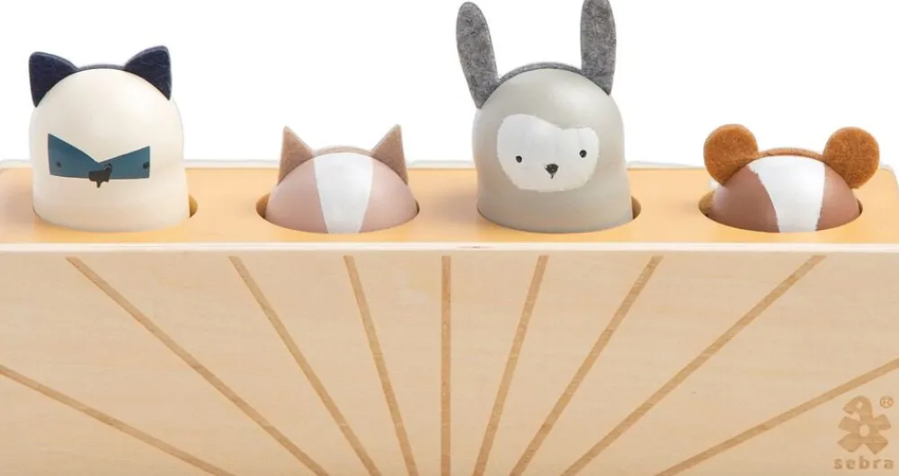 Lad barnet øve sig på at trykke på dyrehovederne, og se begejstringen, når ét dyr trykkes ned, og ét andet hopper op. Legen udvikler dit barns hånd-øje-koordination og er en sjov leg, der aldrig bliver kedelig. Pop-up-legetøjet er designet i Danmark og fremstillet af certificeret træ, der kan holde til flere søskende.