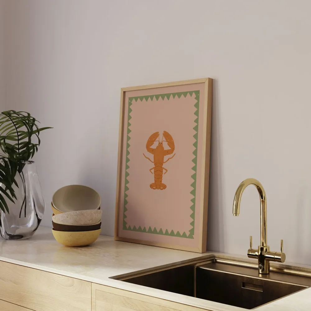 Giv dit hjem et strejf af kystnære charme med denne livlige hummerplakat. Med en dristig orange hummer mod en blød ferskenbaggrund indrammet med en zigzag grøn kant, tilføjer dette kunstværk en legende og nautisk stemning til ethvert rum. Perfekt til fiske- og skaldyrselskere og strand-tema indretning. *Stel sælges separat.