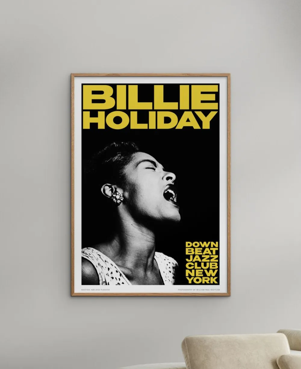 Stilfuld sort-hvid plakat med ikonisk billede af Billie Holiday og kraftfuld gul typografi. Perfekt til musikelskere, jazzfans og retro-indretning. Giver karakter til stuen, musikhjørnet eller kontoret. Print i høj kvalitet med vintage New York jazzklub-stemning.