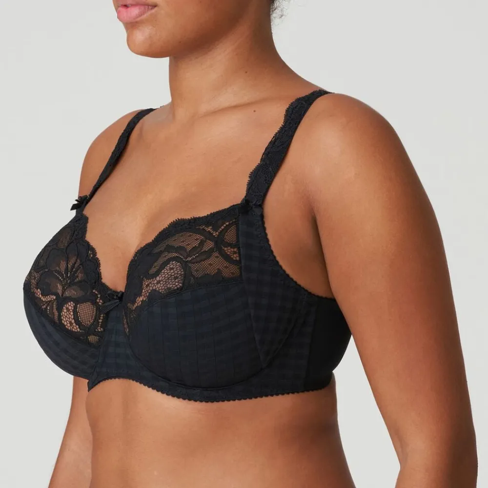 Madison er ikke uden grund en af must have bh´erne fra PrimaDonna. Madison er kendt for det runde fit – de smukke ternede materiale og ikke mindst den elastiske smukke blonde, der pryder både skål og stropperne. Madison er til dig der ønsker en lettere bh men med den elskede PrimaDonna support. Madison kommer i mange forskellige sæson farver og print, men glem ikke den uundværlige basis farve som her i den undværlige sorte.
