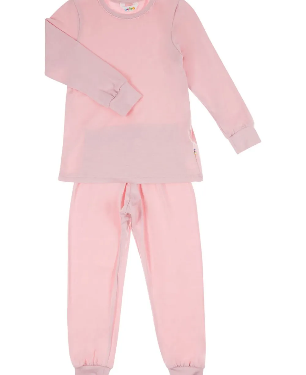 Pyjamas sæt. Bluse i A-facon og med lange ærmer. Piquette stikning i halsen som sød detalje. Bukser med blød logo elastik i taljen. Hele sættet er i en dejlig blød og elastisk viskosekvalitet med bambus og som der er behagelig at have på. Ensfarvet.