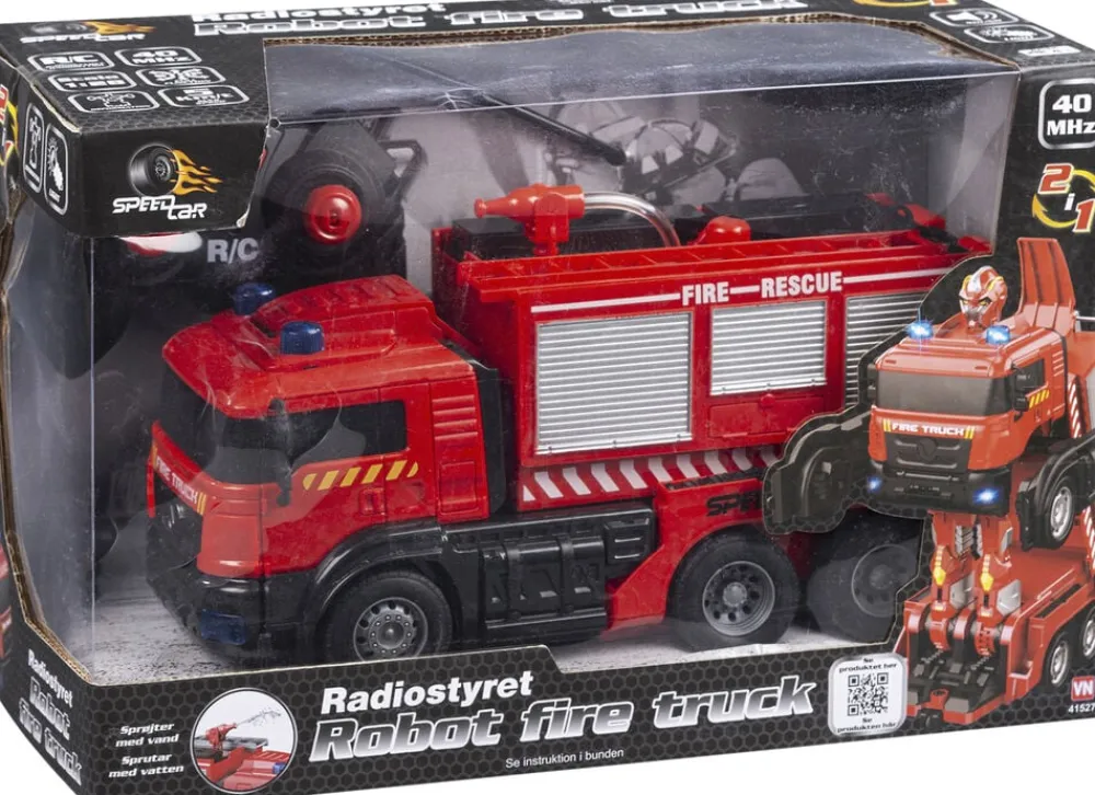 Radiostyret Robot/brandbil med vandfunktion Den sejeste brandbil der kan omdannes til en robot ved tryk på en knap Der medfølger 3,7V 500 MAH LI-ION genopladeligt batteri og USB-kabel til bilen og der skal bruges 2 stk AA-batterier til fjernbetjeningen (ikke inkl)
