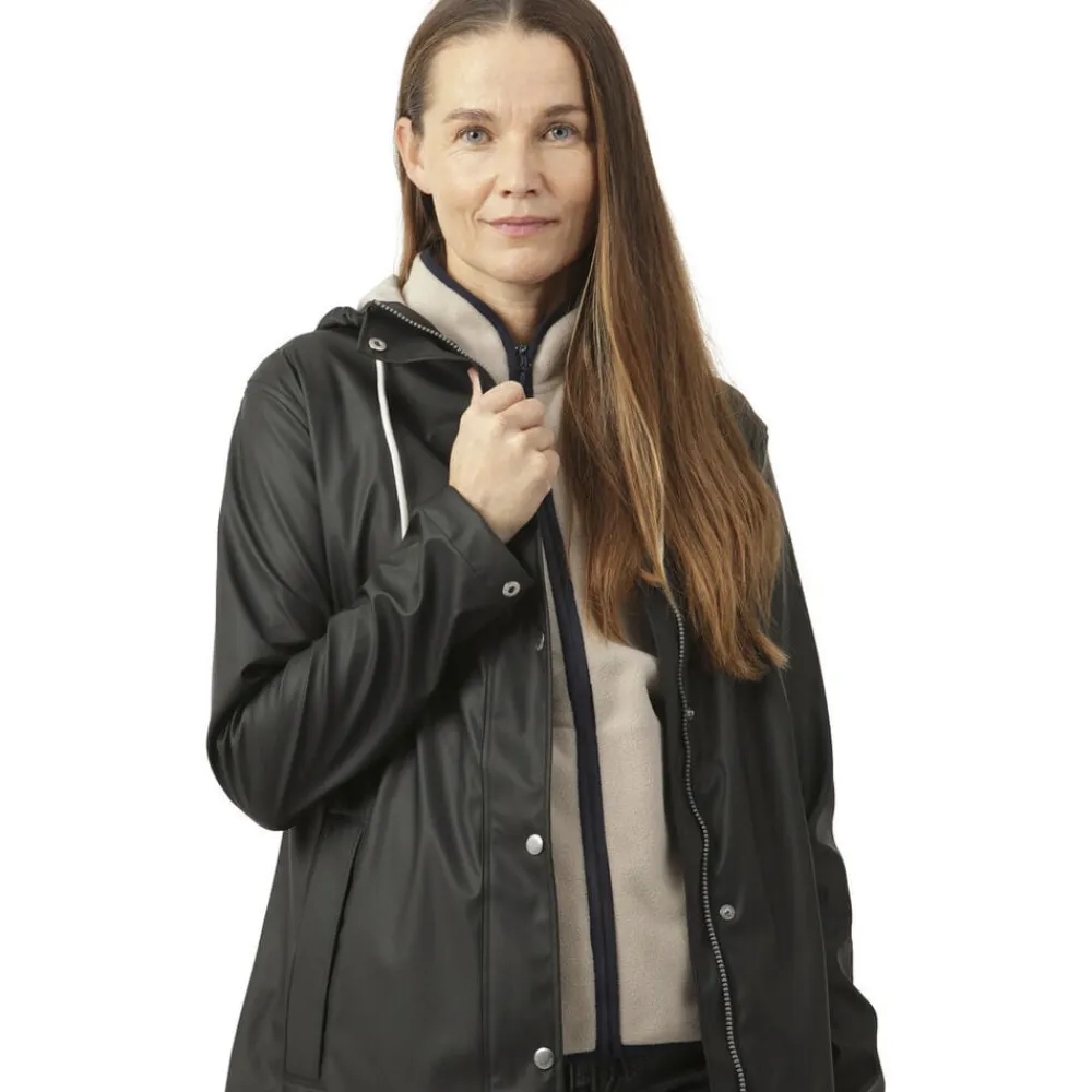 Denne nye, moderne garderobeklassiker er en regnfrakke med lige pasform i slidstærkt, let, gummibelagt, vandtæt PU-belagt stof. Den er fremstillet af eksperter og skræddersyet med svejsede sømme for komplet beskyttelse mod regnen og med en Recycled tricot-bagside for komfort. Hætten med snoretræk med bomuldslook og snørehuller under armene giver bevægelsesfrihed og komfort i ubehageligt vejr. Denne kvalitet tilbyder vejrbeskyttelse med en vandtæt klassificering på 5000 mm.