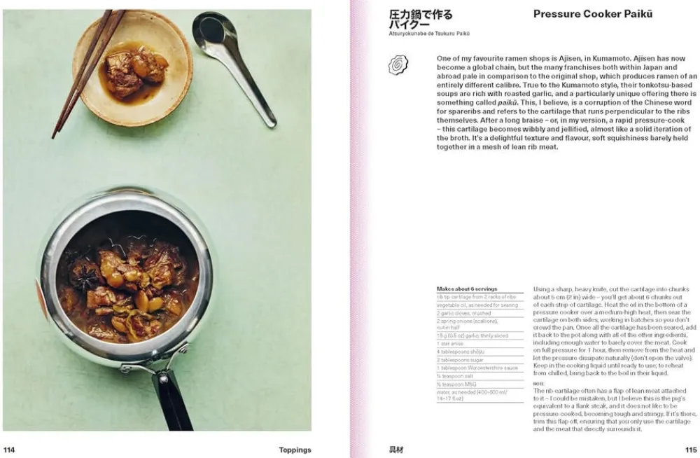 Det er opdelt i fem sektioner – Broth, Seasoning, Aromatic Oils and Fats, Noodles og Toppings – for at gøre det muligt for dig at blande og matche for at skabe din egen ramen, der passer til din smag. Alternativt kan du vælge at følge en af flere komplette ramen opskrifter.
