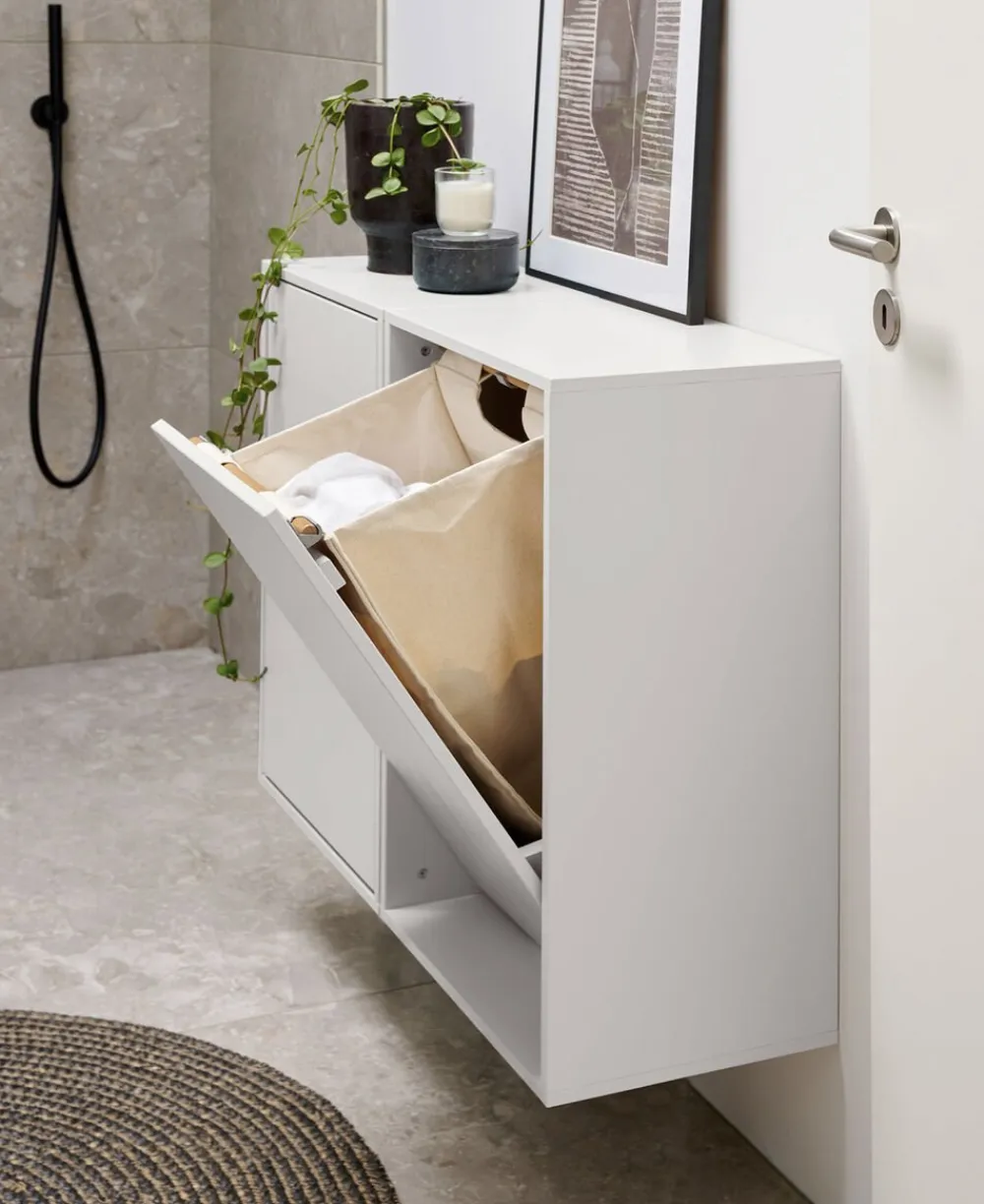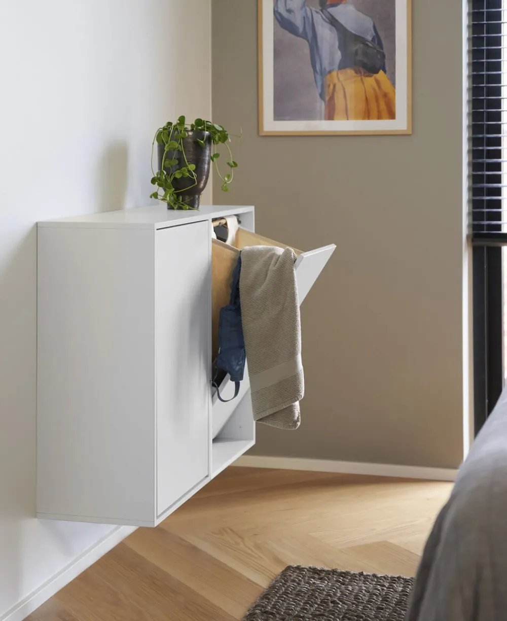 Stilfuld vasketøjskurvDen væghængte vasketøjsboks er designet med fokus på funktionalitet og et enkelt, nordisk udtryk. Det væghængte design gør det muligt at spare plads, lette rengøringen på gulvet og undgå fugt fra badeværelset. Derudover sikrer det en dekorativ og pæn løsning til dit hjem. Med den smarte tryklås kan du nemt åbne boksen, sortere vasketøjet og transportere det fra A til B. Løsningen er også ideel til teenager- eller soveværelset, hvor vasketøjskurven er et stilfuldt indslag, der løser en praktisk udfordring i dagligdagen. Overfladen kan også bruges som hylde til dekorative genstande. Vasketøjsboksen er lavet af træ, og den hørfarvede pose i boksen er syet af GOTS-certificeret tekstil og lamineret med et let plastlag, så posen også holder på fugten fra vådt vasketøj. Alt i alt er ReCollectors’ væghængte vasketøjskurv den perfekte kombination af enkelthed, stil og funktionalitet til dit hjem. Materiale og målMateriale: træBredde: 43 cmHøjde: 70 cmDybde: 30 cmVægt: 10. 5kgVolume: 38LOBS. Vi har valgt at flatpacke vores vasketøjsboks for dermed at kunne effektivisere transporten og undgå transportskader, hvilket i sidste ende reducerer vores CO2 forbrug. Derfor leveres boksen ikke samlet, men via vores udførlige guide er den nem og enkel at samle og montere. VedligeholdelseVasketøjskurven rengøres med en blød, fugtig klud eller svamp. Tilsæt evt. et mildt opvaskemiddel eller sæbe. Eftertørres med en ren, tør klud.