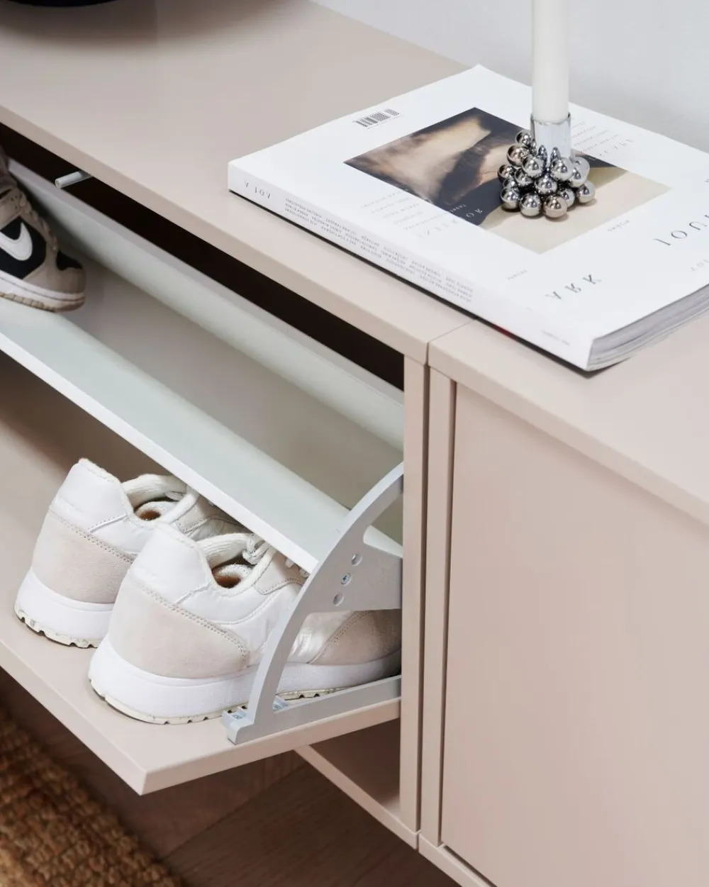Skoboksen er ideel til en indbydende entré, en velassorteret garderobe eller et bryggers med struktur og orden. Det enkle og klassiske design gør det muligt for boksen at passe perfekt ind i din personlige indretning, samtidig med at den tilfører naturlig elegance, orden og funktionalitet til dit hjem.