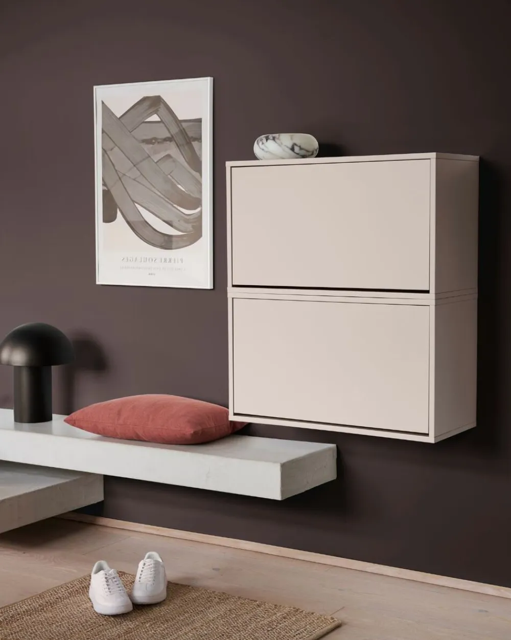 Boksen er væghængt, hvilket betyder, at den ikke optager plads på gulvet og samtidig sikrer let rengøring. Du kan placere skoboksene oven på hinanden, ved siden af hinanden eller på en måde, der passer til din stil og dit hjem. Kombinér dem med vores andre opbevaringsbokse, der følger samme stil og farveunivers, og skab en personlig opbevaringsvæg, der afspejler din smag.