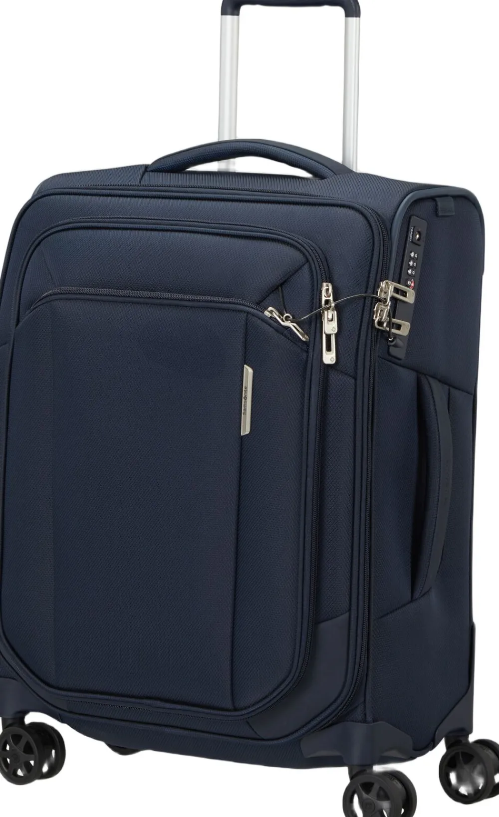 Kabinekuffert hvor både et indvendige og udvendige stor er lavet af genbrugte plastflasker, 4 dobbelte hjul, TSA lås , dobbelt trollystativ, navneskilt, låsbar frontlomme, vægt 2,4 kg,rumindhold 43 l, 5 års garanti,55x40x20 cm.