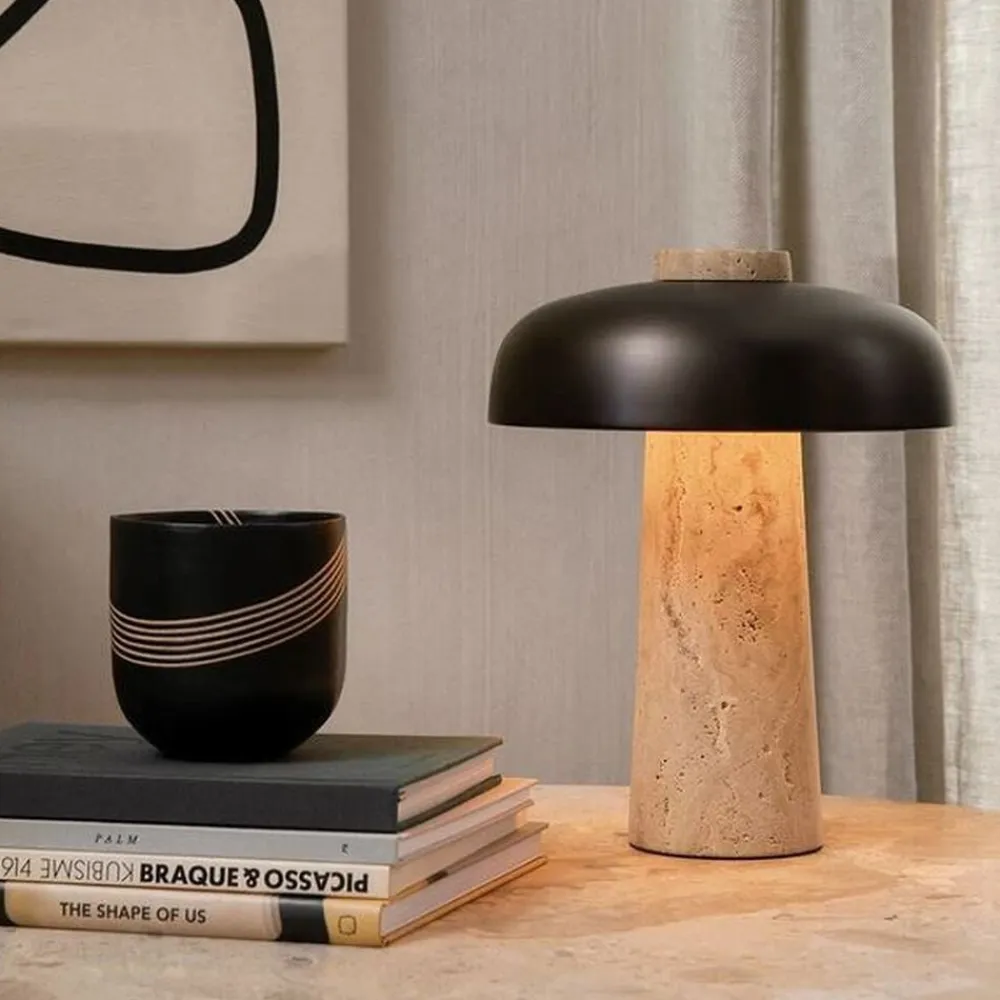 Foden på lampen er lavet i ubehandlet traverin, så den naturlige struktur fremgår. Selve skærmen som elegant hviler på travertin foden er lavet i bruneret aluminium.