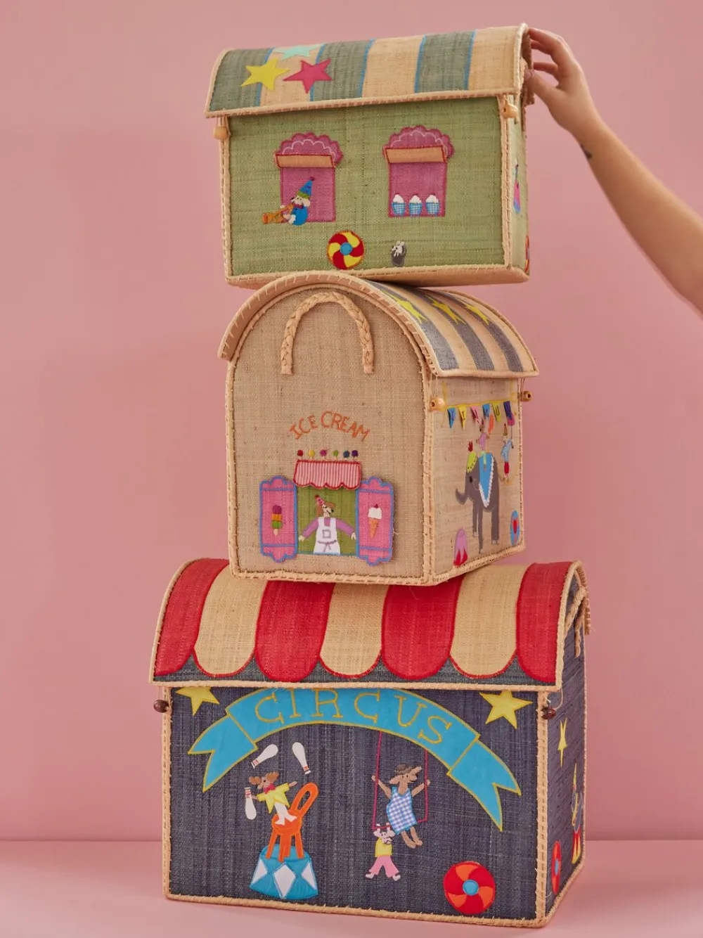Raffiahuse i sæt af tre forskellige størrelser med cirkustema. De fungerer ikke kun som en fantastisk tilføjelse til leg, men også som den ideelle opbevaring til legetøj, bøger og tæpper. Hvert hus er omhyggeligt håndlavet på det smukke Madagaskar.